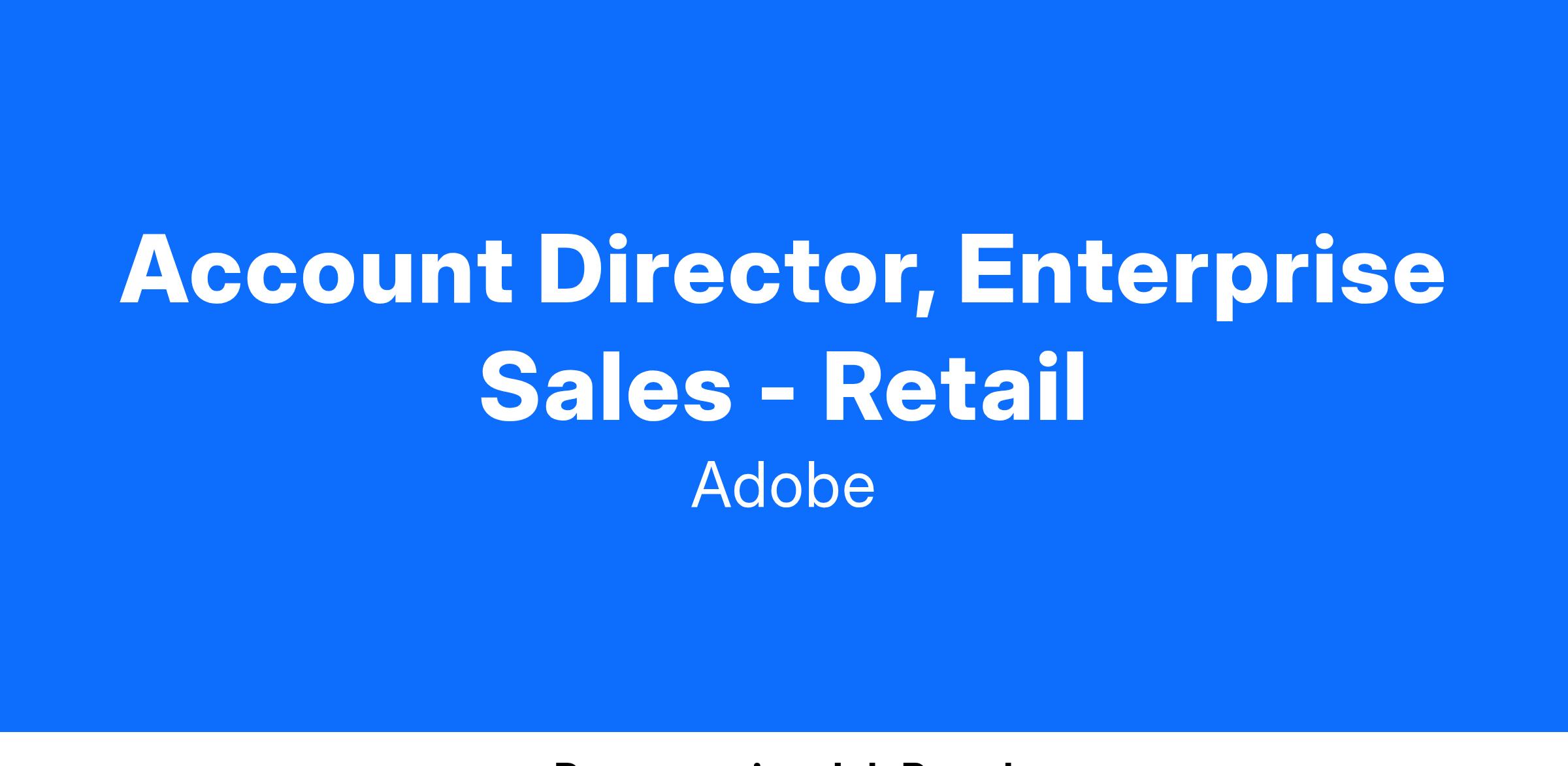Adobe is looking for an Account Director who is responsible for achieving sales targets through the sale of Adobe’s Digital Marketing product lines. As a part of our enterprise sales team, working with Adobe’s largest customers across the Retail industry. This includes the development of long-term relationships with customers as well as crafting strategic account plans. The Account Director will achieve this through software solution selling capabilities and direct, face-to-face contact with the customer. Responsibilities include building relationships at all levels with a focus on c-suite, and effectively navigating the customer's organization. You will guide and assist customers in achieving a successful start with Adobe and help them expand the value realized from our solution. This is a key role at one of the most respected technology companies in Silicon Valley – and the entire US. Successful candidates will be high energy, data-minded, naturally inquisitive, and tech-savvy individual with prior senior level sales experience. Do you value extraordinary benefits, and one of the best places to work in the world?