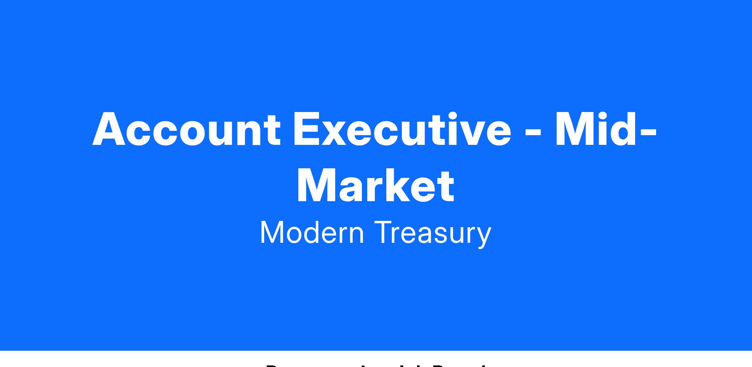 You will own the relationship with prospects, guiding them through the full sales cycle to happy Modern Treasury Customers. We are looking for someone who is comfortable in a multi-party consultative sales process, engaging with both business and technical conversations across multiple levels of an organization including the CFO, CTO, CPO and COO.