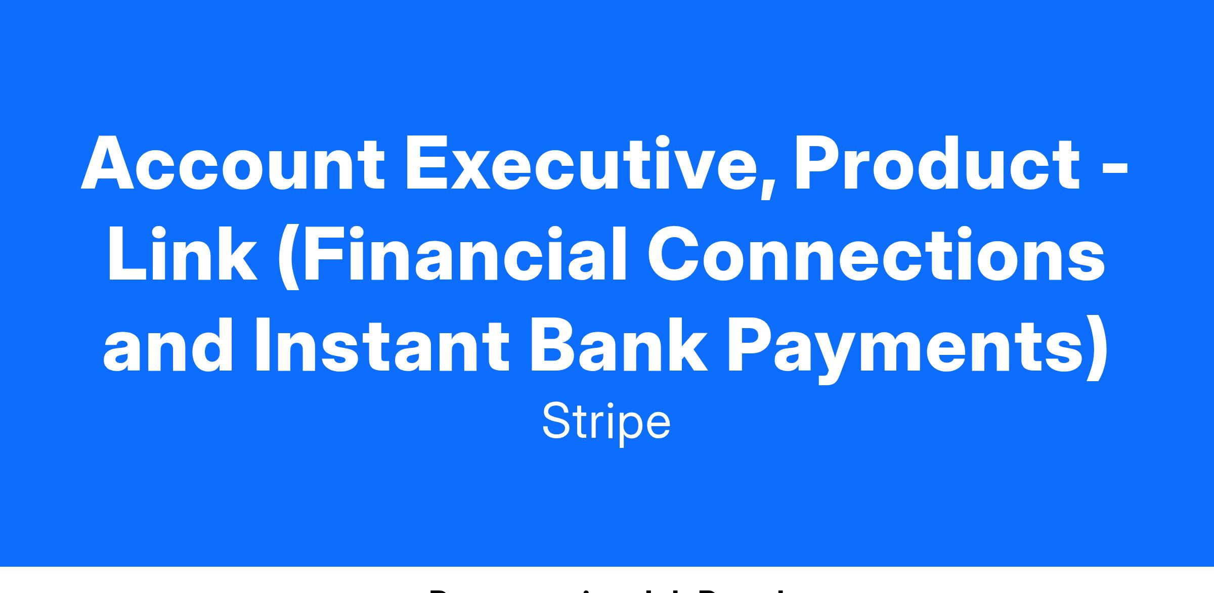 Product Sales is a team of deep functional and technical specialists who both lead and advise on deals for the most strategically important products in Stripe’s portfolio. The Payments Product Sales team is tasked with engaging businesses to take advantage of products like RFA, Tax Issuing, Treasury, Billing, Link and Terminal. Our team is hiring an Account Executive, Product - Link (Financial Connections and Instant Bank Payments).
