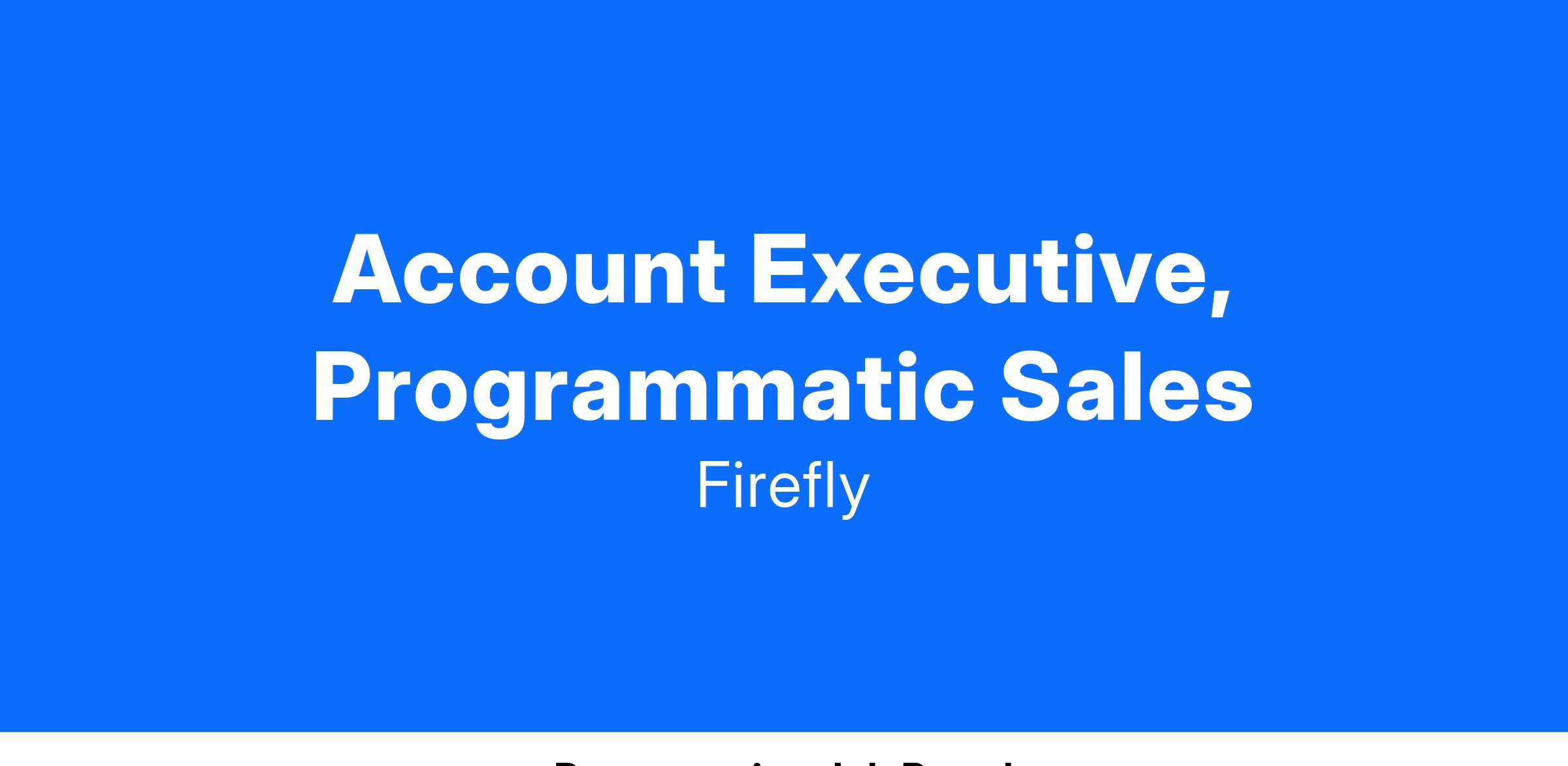 Firefly is seeking Programmatic Account Executive to join our team in Chicago. The sales positions are responsible for pitching and selling Firefly’s suite of digital solutions to programmatic agency teams, trading desks, and client direct in-house programmatic teams with new business as a core responsibility. Ideal candidates are strategic thinkers with solid programmatic buyer relationships, high energy, and have a structured solution selling process to fit Firefly’s category-defining medium.