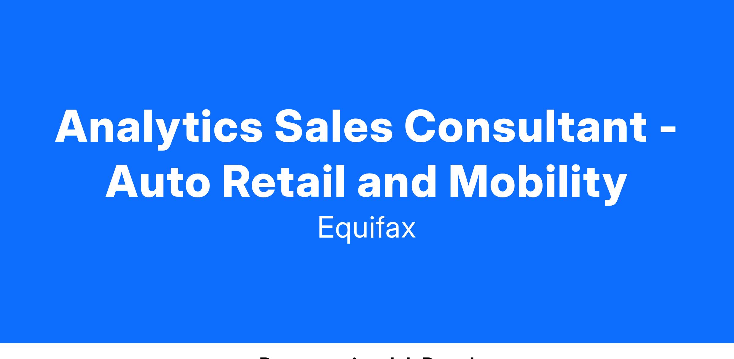 Equifax’s Analytics Sales Consulting team is seeking an Analytics Sales Consultant (ASC) for our Auto Retail and Mobility sales team and their clients, who are a diverse mix of automotive dealers, resellers, rental car companies, and other auto related businesses focused on providing services to consumers and SMBs. The individual in this position will demonstrate the value of Equifax solutions and assets based on actual customer data/input. In doing so, the ASC enhances the client relationship, drives new programs/revenue, and increases Equifax mindshare at their assigned accounts. ASCs are client-facing, quantitative thinkers who have a solid grasp of Equifax’s data and associated assets, an ability to identify and understand the impact of market and economic trends, and a keen understanding of client business needs. They will proactively identify and design quantitative analyses to generate new sales opportunities and support ongoing sales initiatives for the Auto Retail and Mobility sales team.