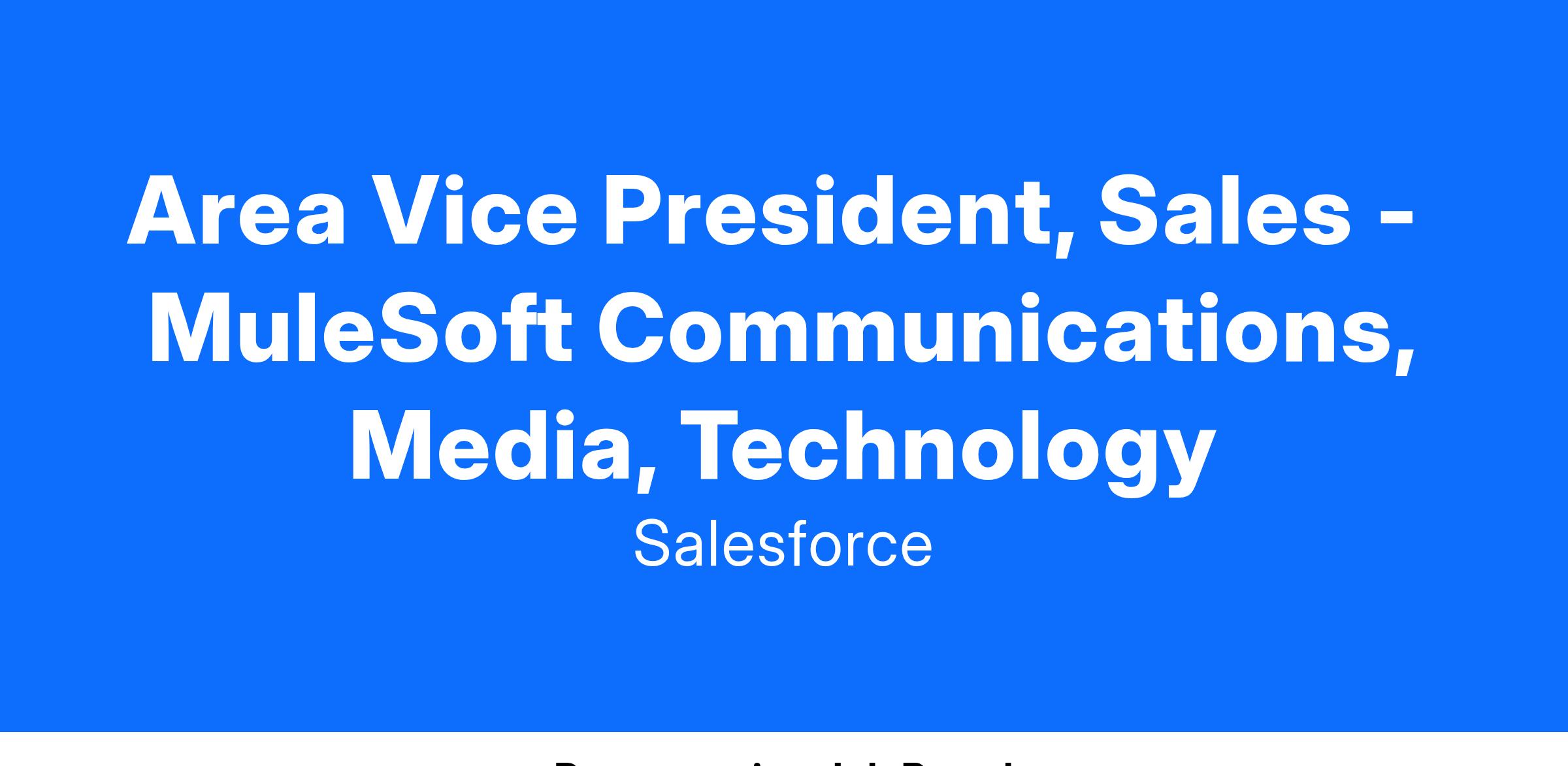 The Area Vice President (AVP), Sales - Communications, Media, Technology (CMT) will lead, drive, and grow CMT sales for MuleSoft across North America. This executive will assume leadership of a growing sales organization, including Regional Vice Presidents and Account Executives.
