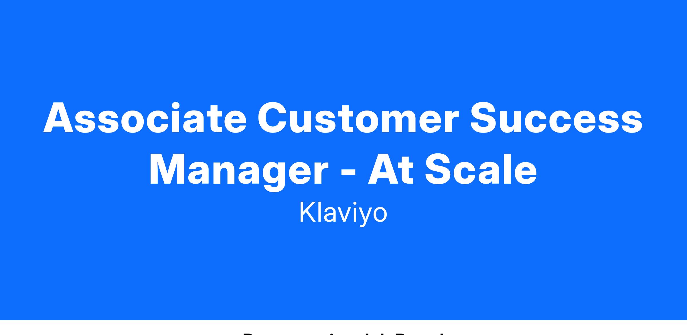 The ideal candidate will have experience in customer facing engagements, email and SMS marketing, or consulting roles, with a demonstrated ability to analyze data and contribute to solutions that address customer needs at scale. We’re looking for an Associate CSM who thrives in dynamic, fast-paced environments, is passionate about learning and growing in customer success, and is eager to contribute to scalable customer success initiatives across a diverse and growing customer base. 1The Associate CSM will work closely with the broader At Scale team to support and scale customer success initiatives, identify areas for improvement, and contribute to the long-term success of our customers.