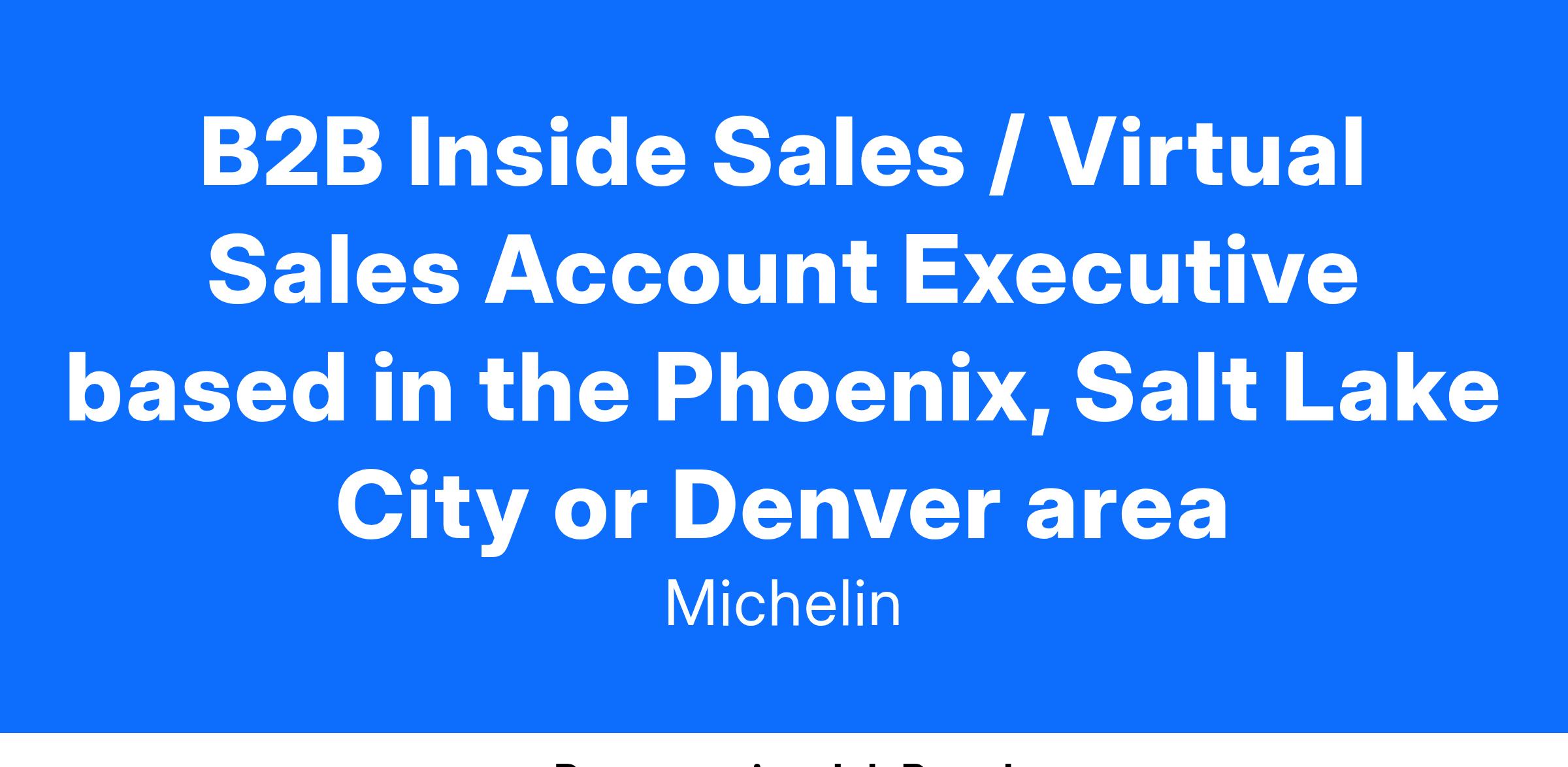 Michelin is hiring a B2B Inside Sales / Virtual Sales Account Executive who will be responsible for selling value-added product & service solutions to commercial fleets & tire dealers located in the Rocky Mountain area. Through virtual account management, you will develop an assigned business portfolio by growing share with existing customers and converting qualified leads and cold calls into new business opportunities. Anchored by Salesforce.com, you will interact primarily in a remote or virtual manner using digital sales tools and best practices.