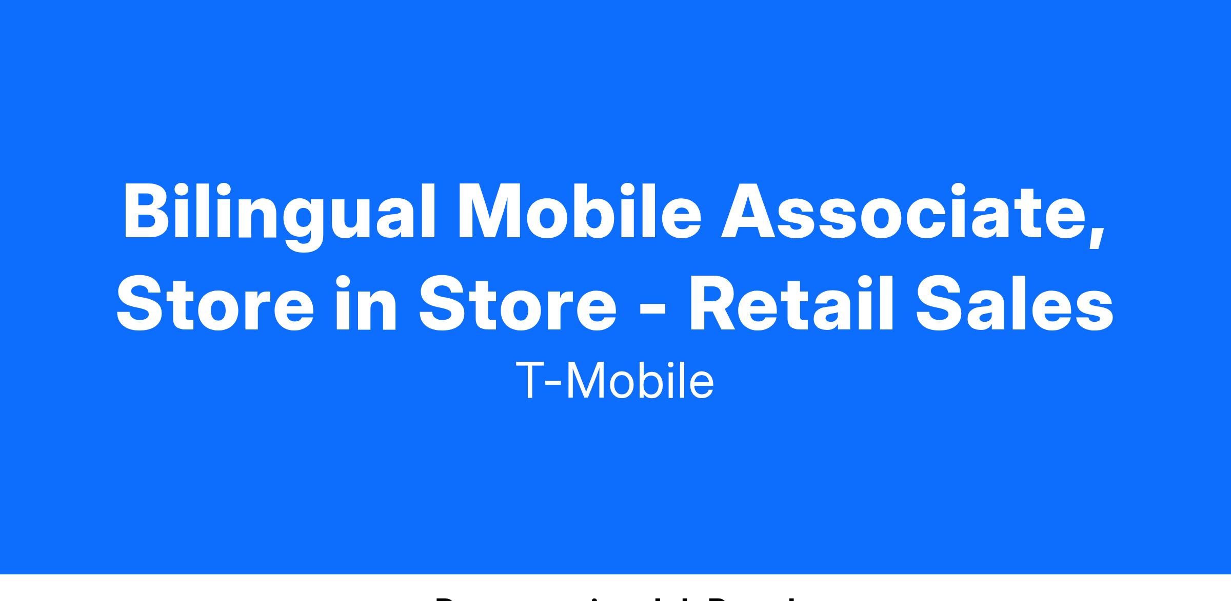 Mobile Associates, Store-in-Store are an integral part of the Retail Team responsible for bringing the T-Mobile brand to life within National Sales partner locations, where active customer engagement is crucial for success. They're ambassadors who create energy and excitement around our products and services. They are obsessed with the connected world and thrive in a high-traffic environment, where technology innovations, customer needs and the Retail experience are continuously evolving. Mobile Associates excel at building and deepening relationships with customers through meaningful interactions. They are skilled at identifying customer needs and are passionate about educating, demonstrating, and recommending solutions. Mobile Associate SiS, exceed their performance targets Doing it the Right Way, by excelling in sales, providing exceptional customer experiences, and meeting quality of sale metrics.