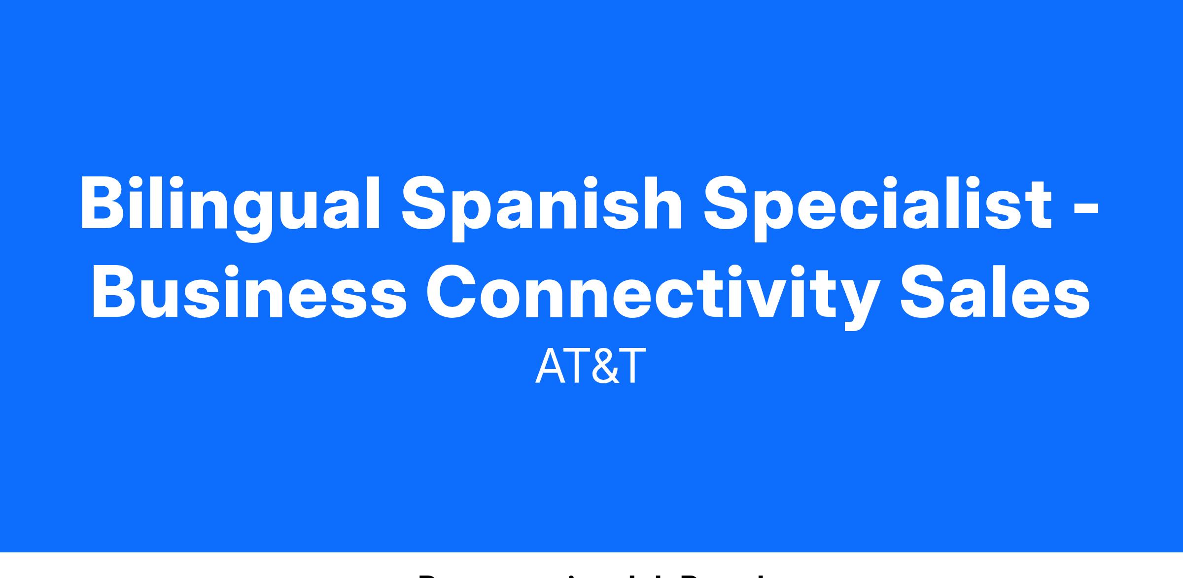 Our Bilingual Spanish Specialist - Business Connectivity Sales earn between $32,800 - $49,200 + commission with a total target compensation of $72,800 – $89,200. Not to mention all the other amazing rewards that working at AT&T offers. From health insurance to tuition reimbursement and paid time off to discounts on products and services just to name a few. There is a lot to be excited about around here. Individual starting salary within this range may depend on geography, experience, expertise, and education/training.