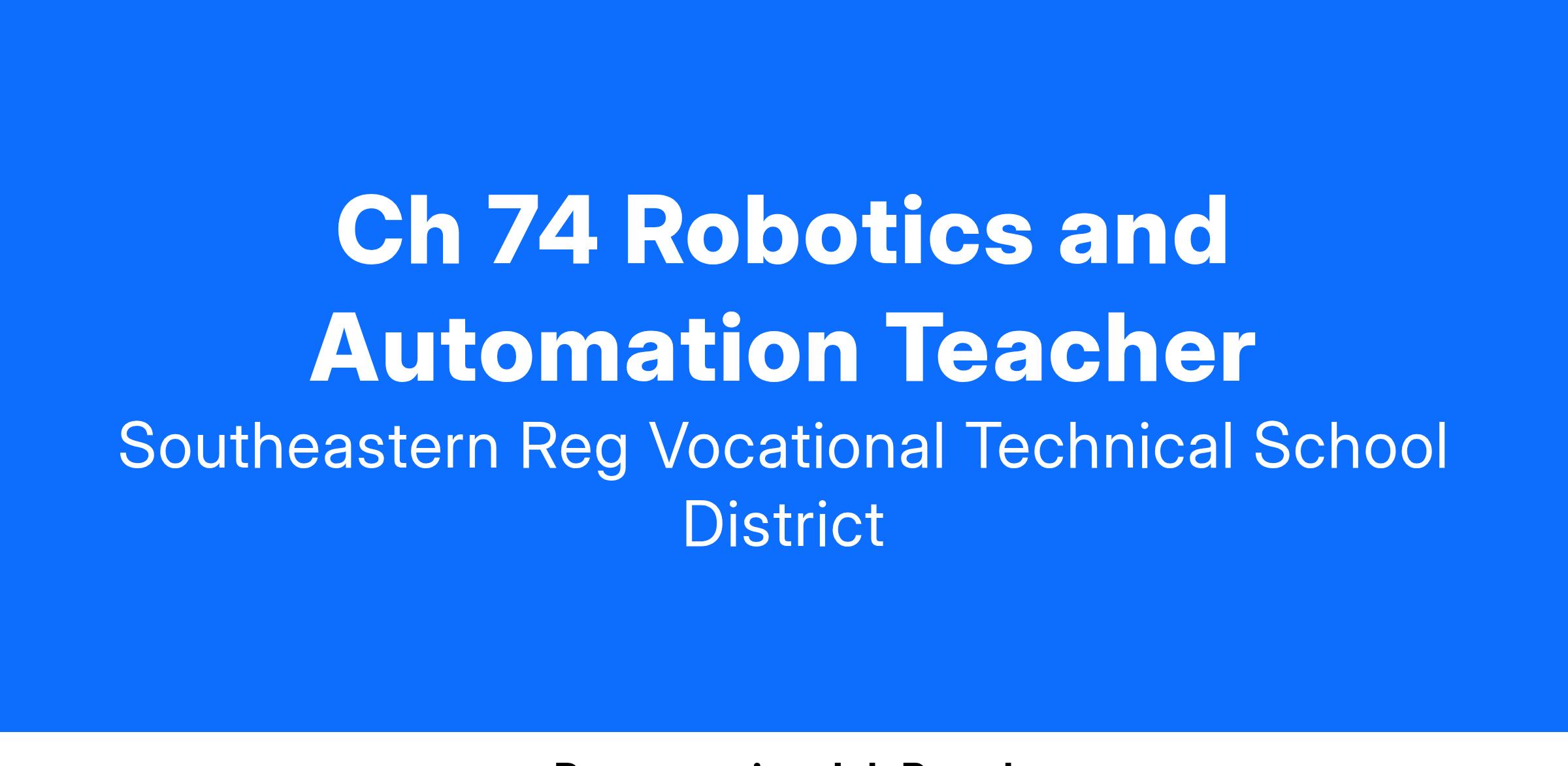 DESCRIPTION: Southeastern Regional is seeking a Ch. 74 Robotics and Automation teacher to begin a new program. Preferred candidates will hold a Chapter 74 Robotics and Automation license or meet the qualifications to obtain one. Satisfactory CORI, Statewide Applicant Fingerprint Identification Services (SAFIS), and SORI required. Bilingual preferred.