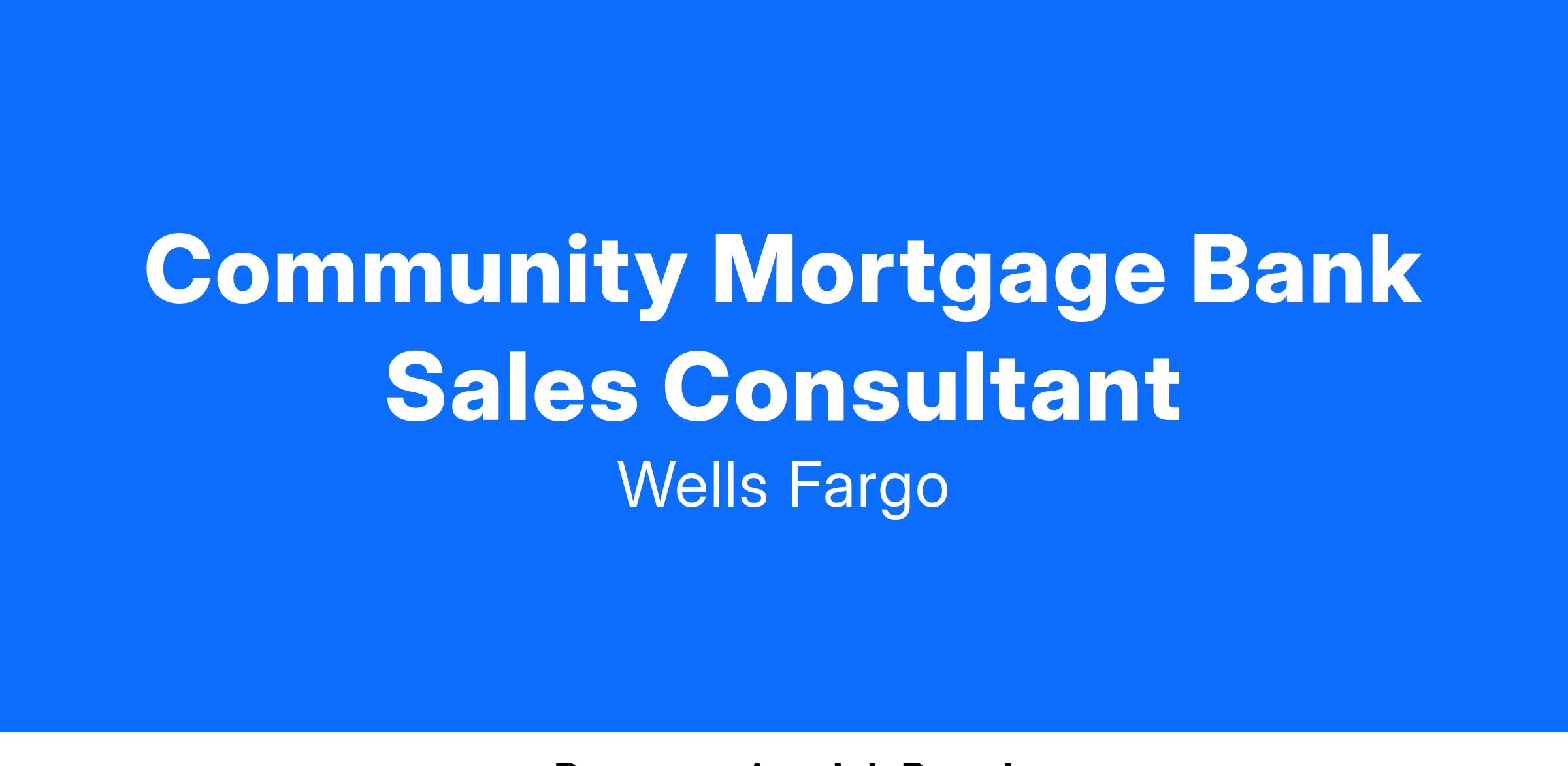 Wells Fargo is seeking a Community Mortgage Bank Sales Consultant (SAFE) in Consumer Lending as part of Home Lending. For additional information on this line of business, refer to the external Careers Site at www.wellsfargojobs.com.
