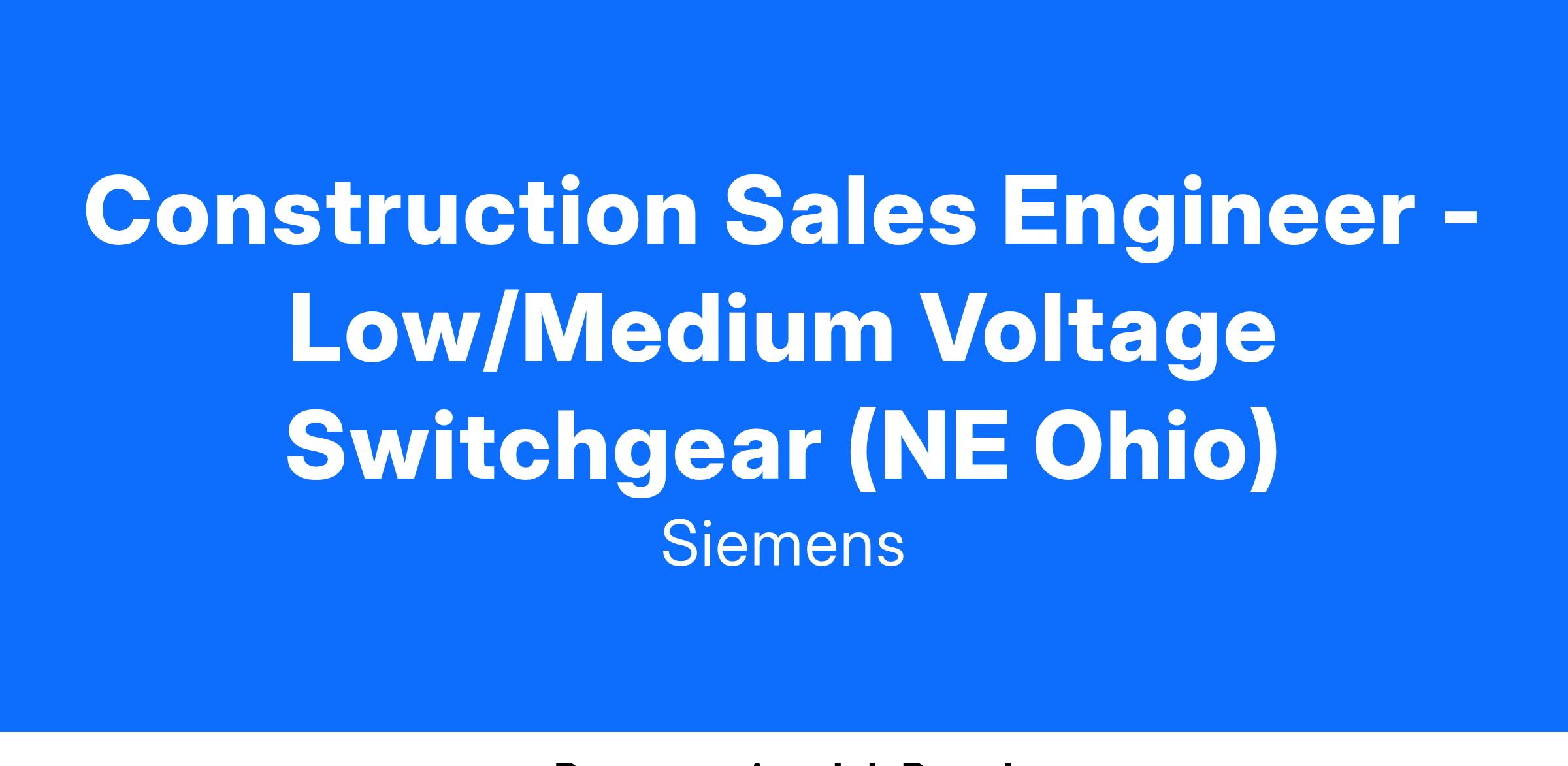 Construction Sales Engineer - Low/Medium Voltage Switchgear (North East Ohio)