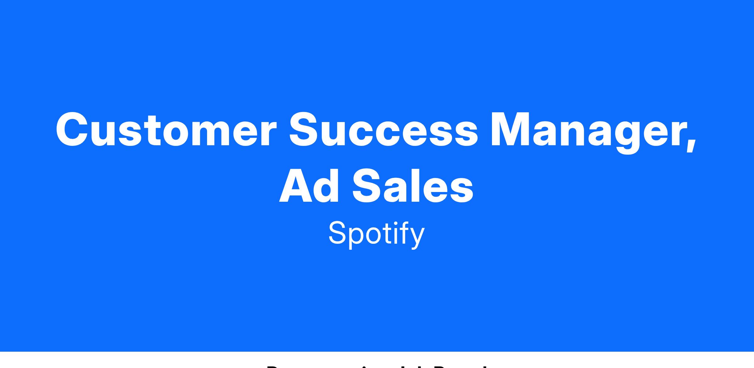 Sell what you love. For us and millions of users across the globe, that’s Spotify. Join the Customer Success team within our Advertising Sales business and you’ll build the relationships that help grow our business in existing markets and beyond. We don’t just sell creative solutions to our clients and partners, we help to craft them; using our expert knowledge of ad products, sales channels and the industry to impact the way the world experiences music and podcasts.