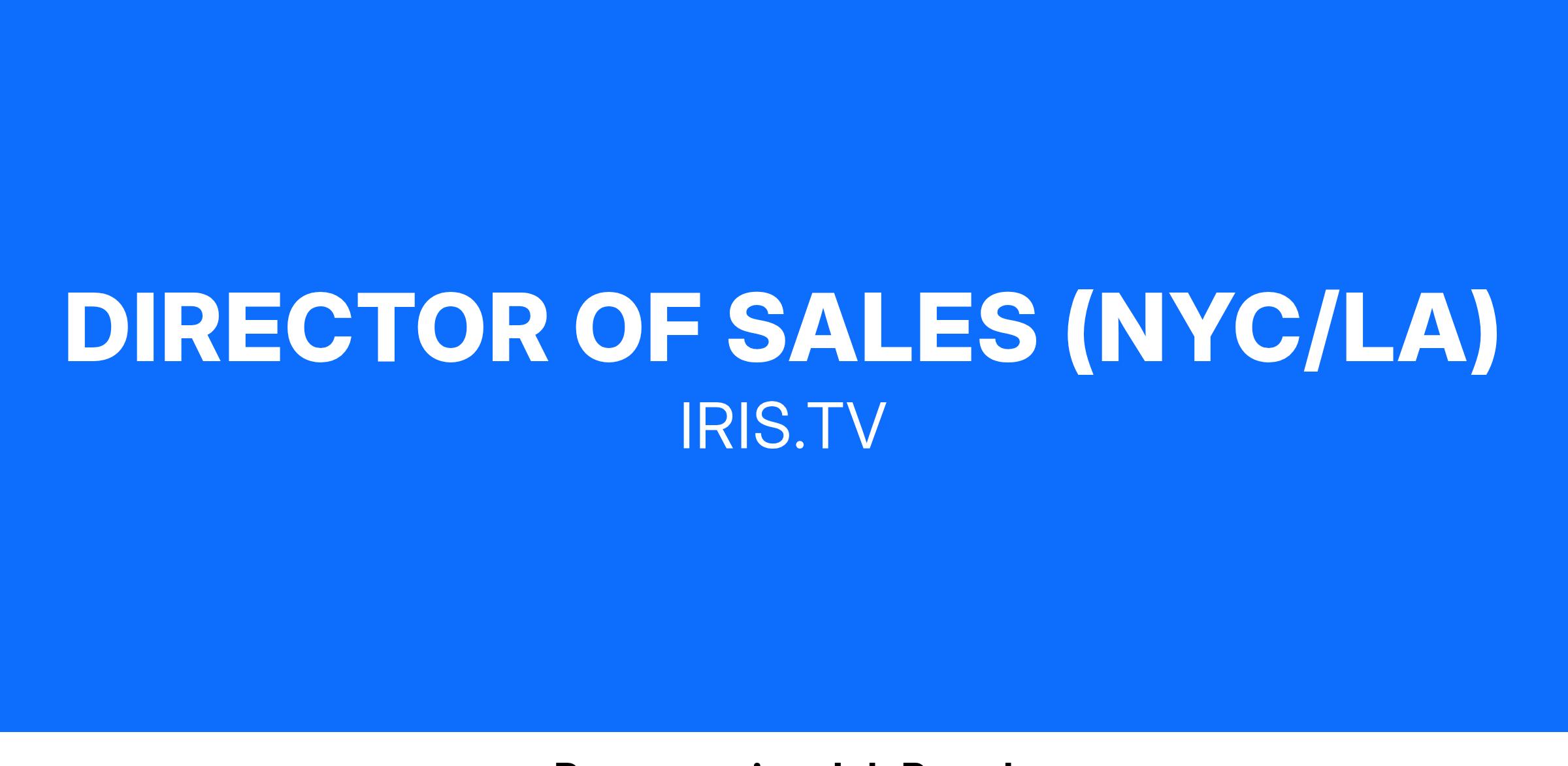 IRIS.TV is looking for a Director of Sales in New York or Los Angeles. This is an individual contributor role reporting directly to the EVP Ad Platforms and Agencies, where you will be responsible for prospecting and establishing strong relationships within major Holding Companies, independent media buying agencies, and agency trading desks.