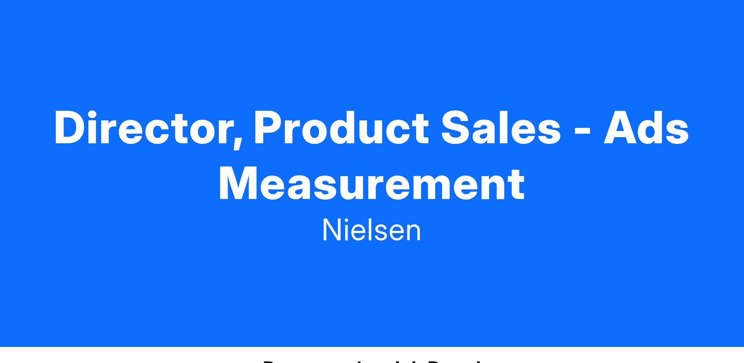 The Director, Product Sales will lead our Ads Measurement business for Advertiser and agency clients. This role will engage with clients directly to identify needs and determine the measurement products and solutions that address their business objectives. This individual will draw upon a deep understanding of industry and analytical capabilities to develop, pitch, and deliver a complete solution. The Director will work with internal sales partners on client proposals and present compelling pitches that demonstrate Nielsen’s value, winning both new and repeat business. This person will collaborate with Nielsen leaders in marketing and product to ensure go-to-market strategies and deliverables meet revenue, client and marketplace expectations.