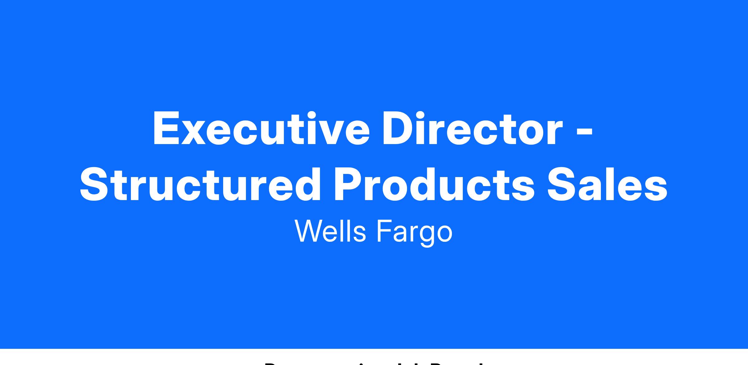 Wells Fargo is seeking an Executive Director to join our Structured Products Sales team in our El Segundo, CA office. They will be responsible for the distribution of Fixed Income Products to our Structured Products Sales investor base. The ideal candidate will have 7+ years of Direct Sales experience and proven relationships with large Institutional clients in the region.
