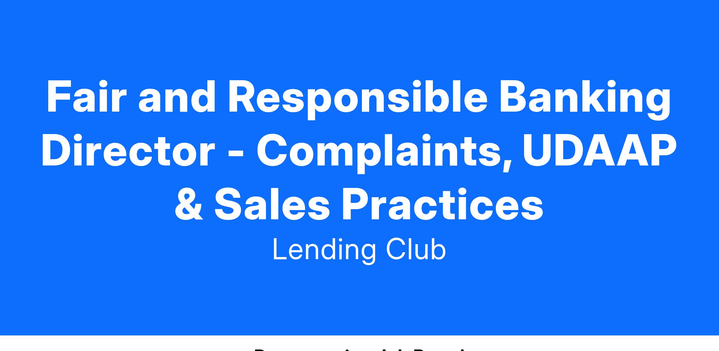 LendingClub Compliance Department is seeking an experienced and qualified compliance professional to fill the role of Fair and Responsible Banking Director (F&RB Director). This position will be primarily responsible for overseeing and monitoring the Bank’s consumer complaint management program. Additional responsibilities shall include oversight of UDAAP and Sales Practices for effectiveness and regulatory compliance. The F&RB Director will serve as a “compliance advisor” to first line management to ensure operational policies and procedures in place for managing consumer complaints, UDAAP and Sales Practices to meet regulatory standards and support the company’s implementation of an effective Compliance Management System (CMS).