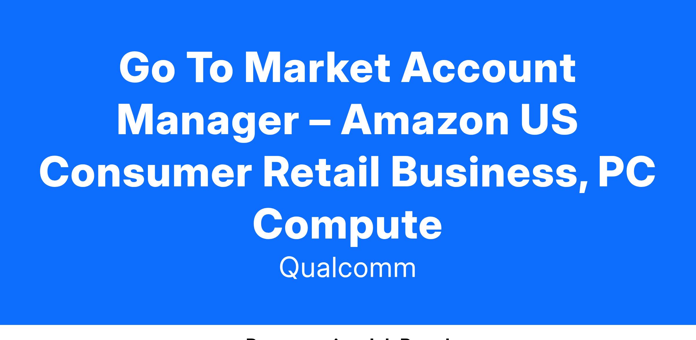 Job Summary: The Amazon US Consumer Channel Account Manager will be responsible for driving retailer specific account management, partnering with sales counterpart on sell-in forecasting, and sell-through optimization. The account manager will focus on building channel relationships inclusive with category buyers at Amazon. The selected candidate will manage sell-through activities with Amazon while working cross-functionally within Qualcomm to build coordinated marketing campaigns that drive sales of compute products. The channel manager will focus on driving Snapdragon compute products into the channel and developing winning strategies to expand assortment and accelerate sales velocity with our channel partners.