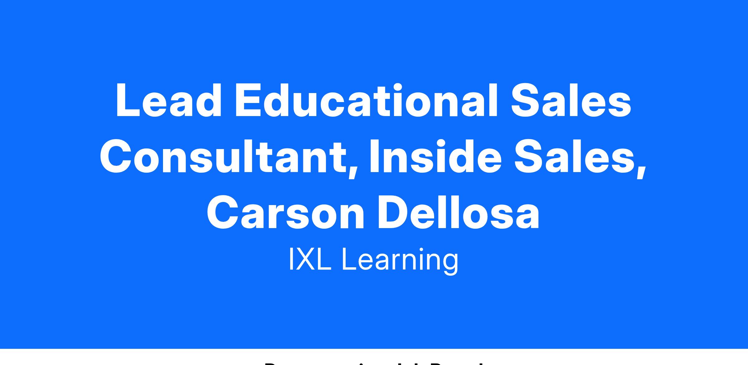 IXL Learning, developer of personalized learning products used by millions of people globally, is seeking an upbeat, focused, high-energy individual to lead our Carson Dellosa Inside Sales team. Carson Dellosa Education, now a part of the IXL family of brands, was founded in 1977 by two teachers. Over forty years later, we remain committed to creating educational solutions for children, teachers, and parentsβwherever they are needed. #LI-TM1