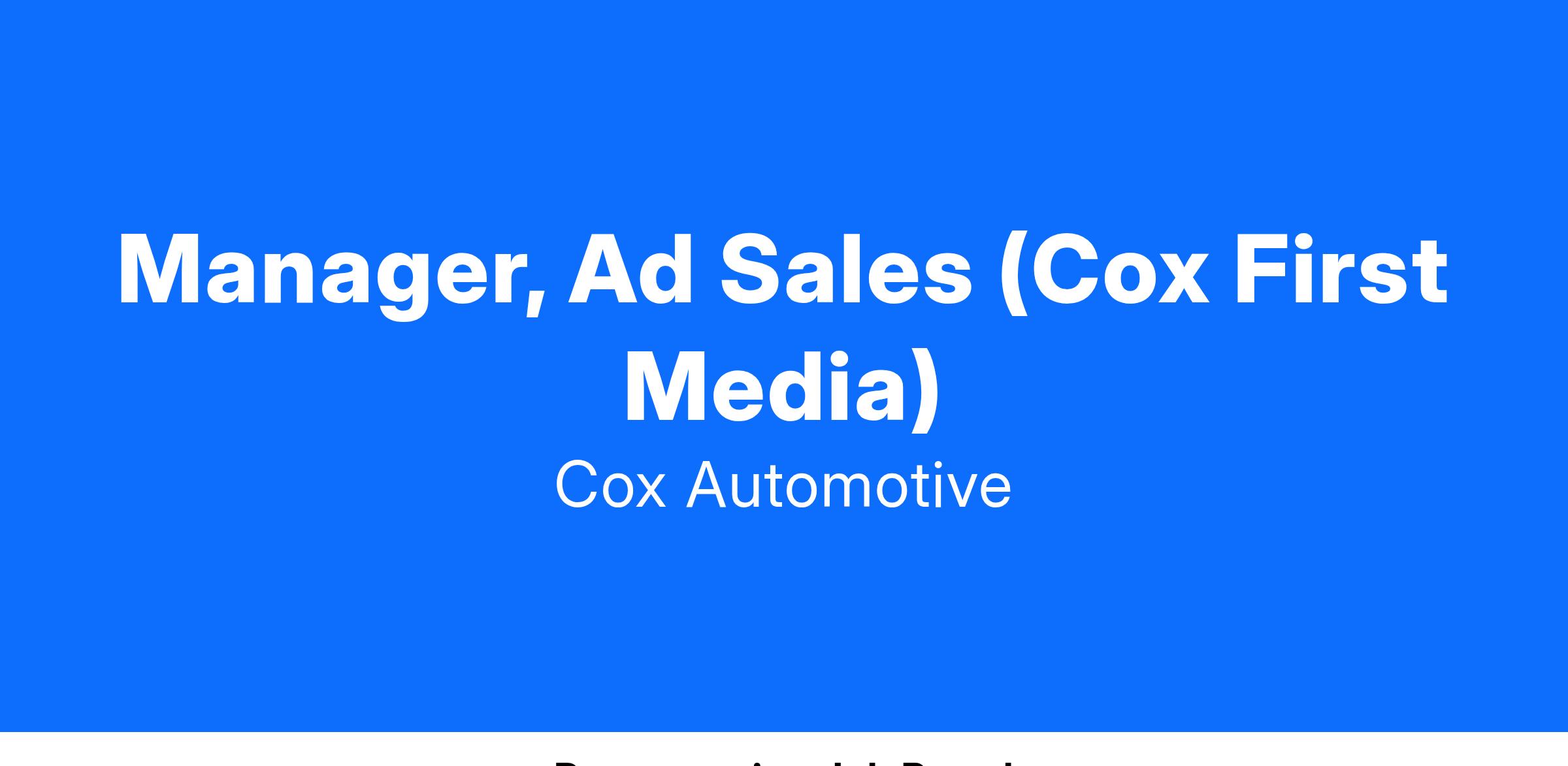 The Manager of Ad Sales directly oversees the Cox First Media advertising business to maximize revenue with a focus on digital and fully execute all campaigns. Responsible for leading the strategy, reporting, and analysis to drive revenue growth, this position will manage a team of media consultants that will provide tactics and solutions, end to end execution and reporting on all campaigns. The ideal candidate exhibits a strong digital acumen and passion for staying on top of the latest opportunities in the space, exploring new ways to leverage digital platforms to connect with key audiences, and drives performance across channels and campaigns.