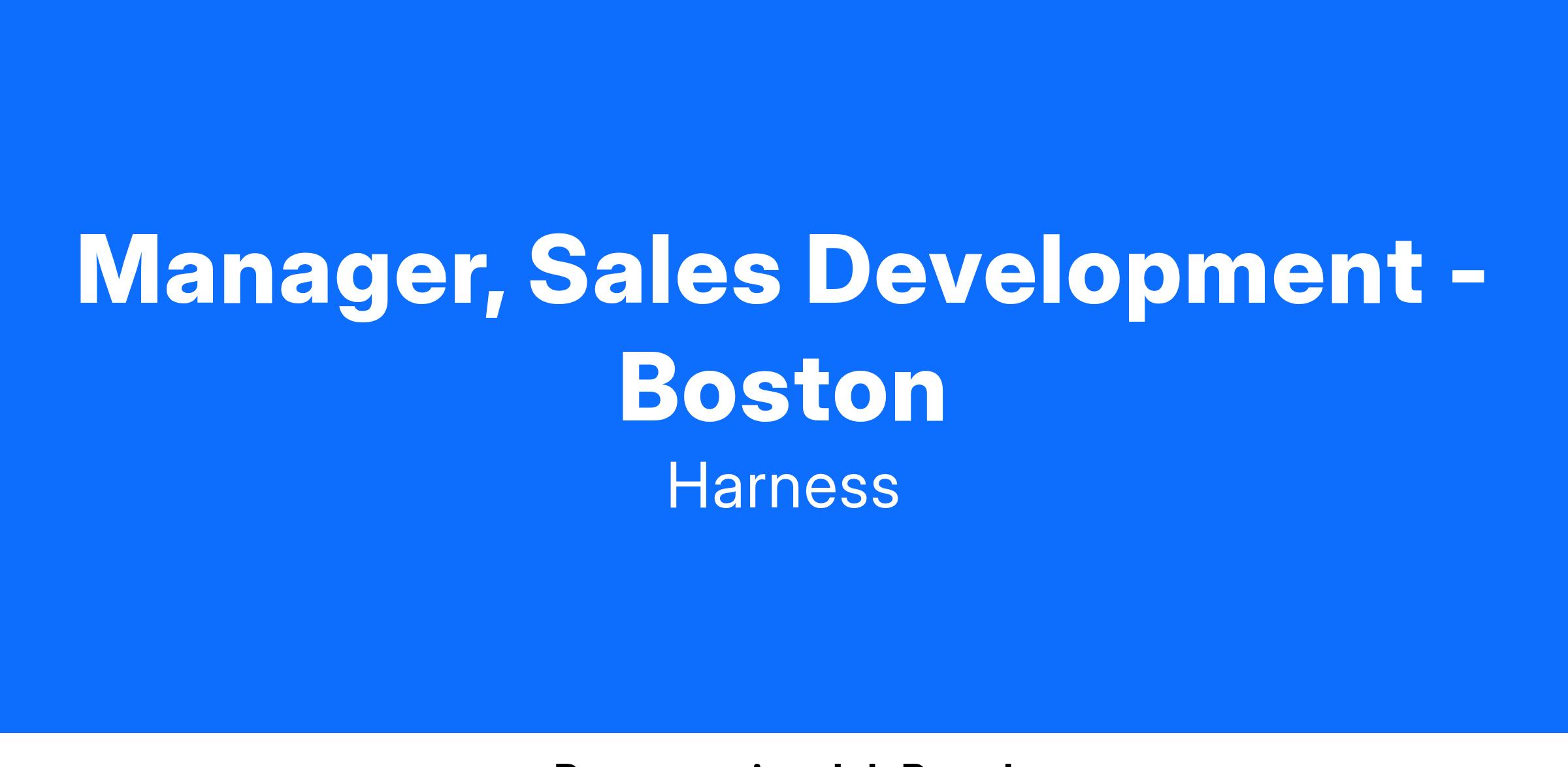 Our Sales Development team is growing and we are looking for a Manager of Sales Development in Boston! Harness is looking for leaders who are passionate about coaching & developing young sales professionals into future AE’s and leaders in our sales org. In this role, you will not only hire, coach, train and mentor SDRs but you will also partner cross functionally with marketing, sales, enablement, and revenue operations with the main goal to drive pipeline generation and revenue for the business.
