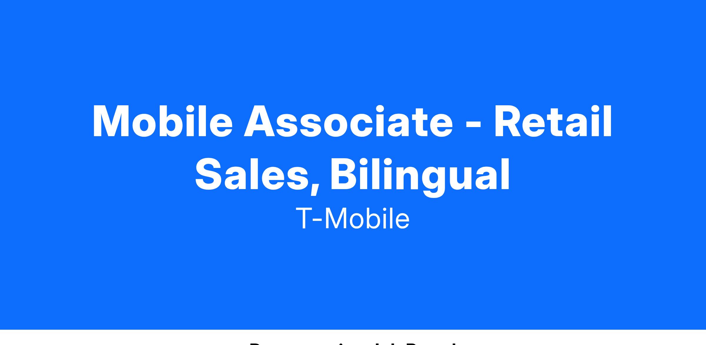 Mobile Associates (MA) work as a member of a Retail Team of Experts to bring the T-Mobile brand to life. They're brand ambassadors who build energy and excitement around our products and services. They are passionate about the connected world and thrive in a fast-paced environment, where technology innovations, customer needs, and the Retail experience are continuously evolving. They immerse themselves in significant connections with our customers, and their ability to build new and deepen existing relationships is unmatched across the wireless industry. They continuously work to build expertise in uncovering our customers' needs and have a passion to educate, demonstrate and recommend device and service solutions. This role is a learning role, where new associates are working with their team and proactively building skills and proficiencies, in preparation for the next level up as a Mobile Expert. As a Mobile Associate, you will be required to successfully complete new employee training.