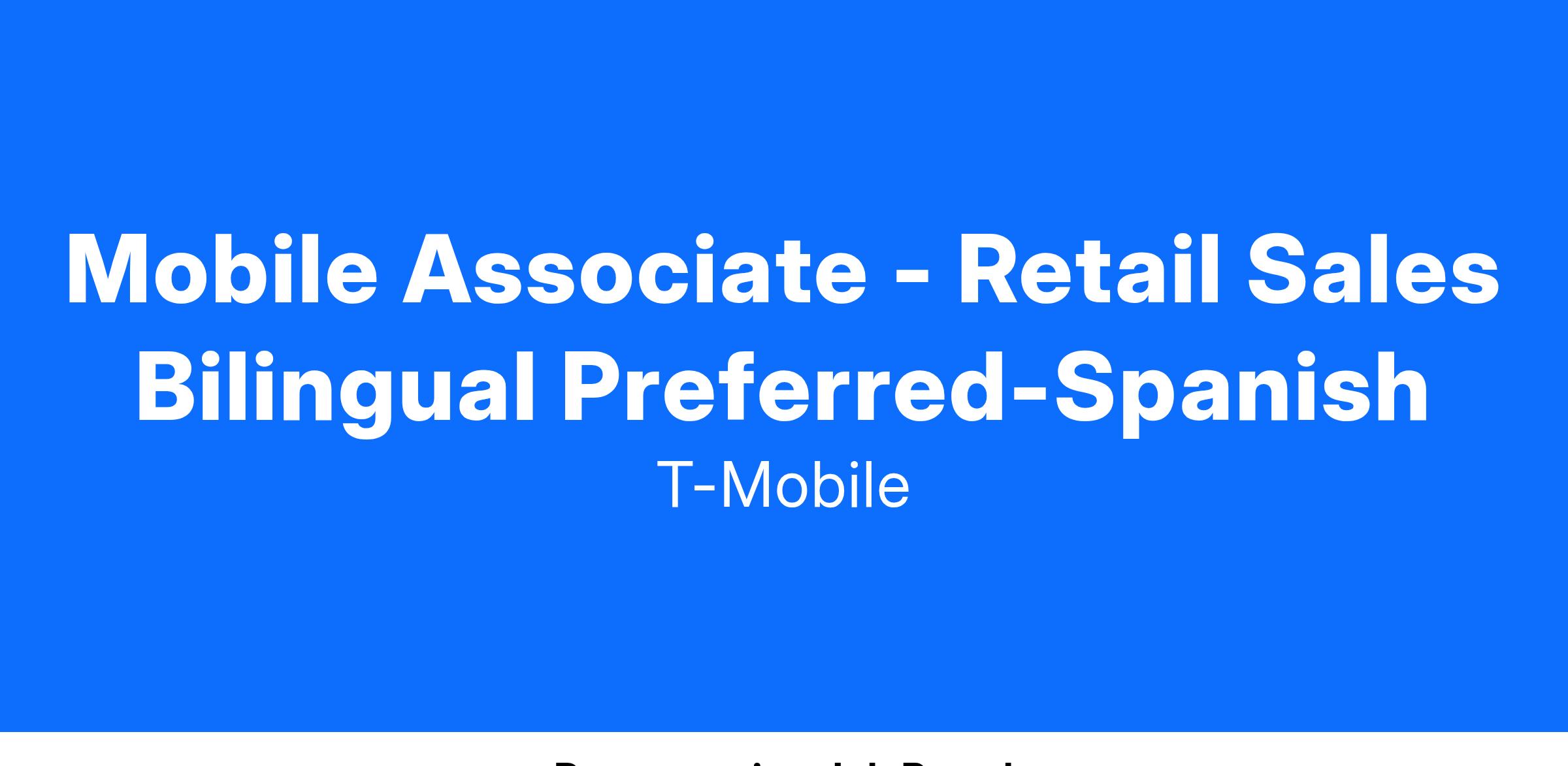 Mobile Associates (MA) work as a member of a Retail Team of Experts to bring the T-Mobile brand to life. They're brand ambassadors who build energy and excitement around our products and services. They are passionate about the connected world and thrive in a fast-paced environment, where technology innovations, customer needs, and the Retail experience are continuously evolving. They immerse themselves in significant connections with our customers, and their ability to build new and deepen existing relationships is unmatched across the wireless industry. They continuously work to build expertise in uncovering our customers' needs and have a passion to educate, demonstrate and recommend device and service solutions. This role is a learning role, where new associates are working with their team and proactively building skills and proficiencies, in preparation for the next level up as a Mobile Expert. As a Mobile Associate, you will be required to successfully complete new employee training.