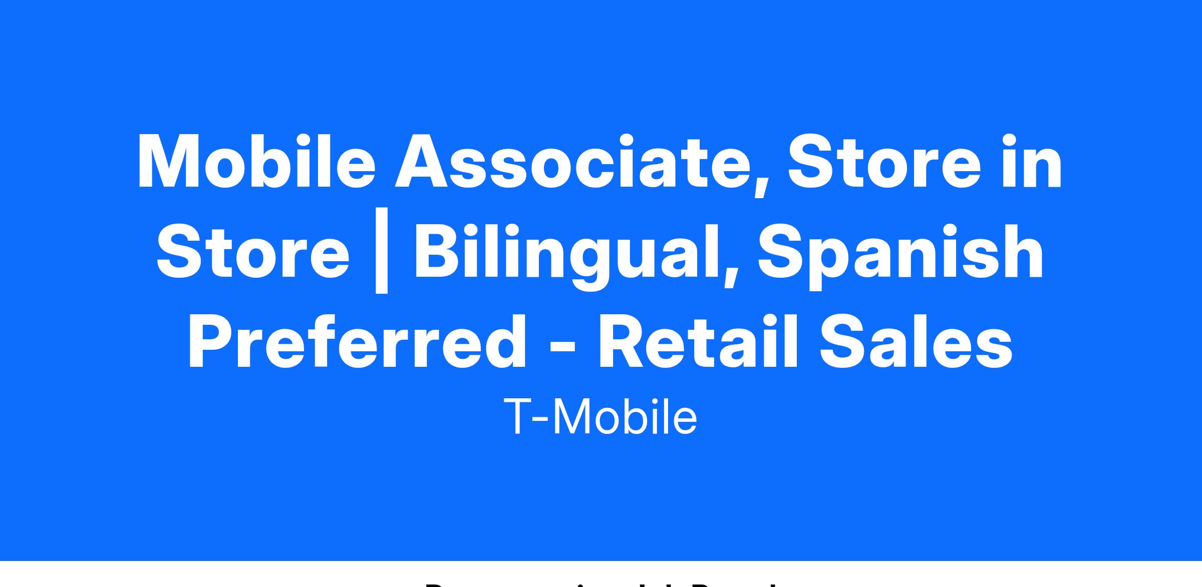 Mobile Associates, Store-in-Store are an integral part of the Retail Team responsible for bringing the T-Mobile brand to life within National Sales partner locations, where active customer engagement is crucial for success. They're ambassadors who create energy and excitement around our products and services. They are obsessed with the connected world and thrive in a high-traffic environment, where technology innovations, customer needs and the Retail experience are continuously evolving. Mobile Associates excel at building and deepening relationships with customers through meaningful interactions. They are skilled at identifying customer needs and are passionate about educating, demonstrating, and recommending solutions. Mobile Associate SiS, exceed their performance targets Doing it the Right Way, by excelling in sales, providing exceptional customer experiences, and meeting quality of sale metrics.