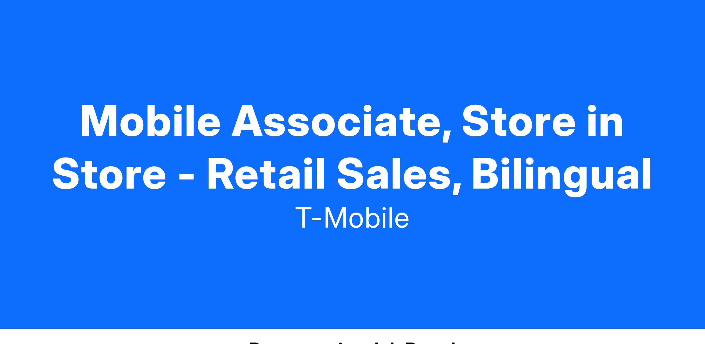 Mobile Associates, Store-in-Store are an integral part of the Retail Team responsible for bringing the T-Mobile brand to life within National Sales partner locations, where active customer engagement is crucial for success. They're ambassadors who create energy and excitement around our products and services. They are obsessed with the connected world and thrive in a high-traffic environment, where technology innovations, customer needs and the Retail experience are continuously evolving. Mobile Associates excel at building and deepening relationships with customers through meaningful interactions. They are skilled at identifying customer needs and are passionate about educating, demonstrating, and recommending solutions. Mobile Associate SiS, exceed their performance targets Doing it the Right Way, by excelling in sales, providing exceptional customer experiences, and meeting quality of sale metrics.