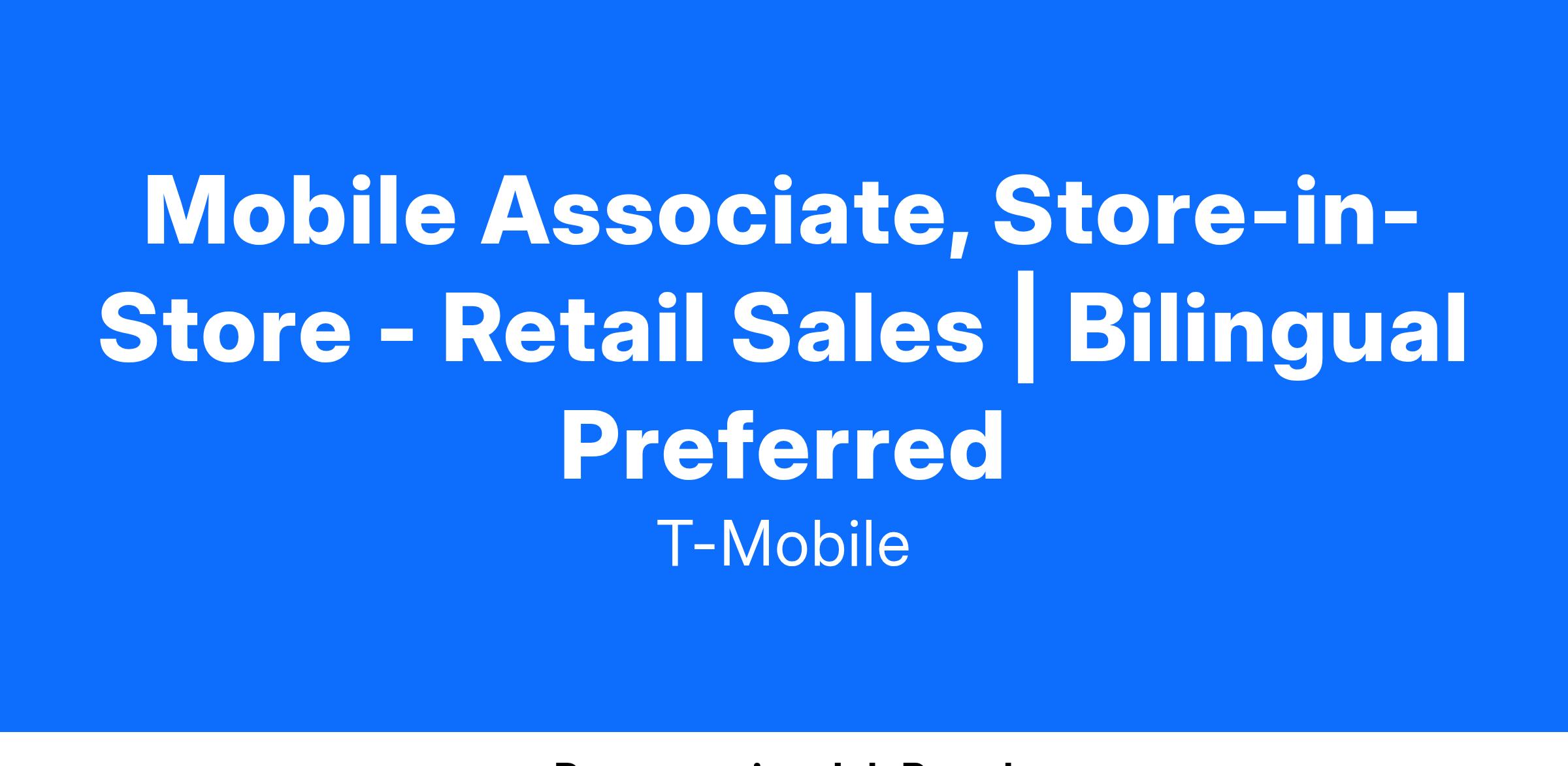 Mobile Associates, Store-in-Store are an integral part of the Retail Team responsible for bringing the T-Mobile brand to life within National Sales partner locations, where active customer engagement is crucial for success. They're ambassadors who create energy and excitement around our products and services. They are obsessed with the connected world and thrive in a high-traffic environment, where technology innovations, customer needs and the Retail experience are continuously evolving. Mobile Associates excel at building and deepening relationships with customers through meaningful interactions. They are skilled at identifying customer needs and are passionate about educating, demonstrating, and recommending solutions. Mobile Associate SiS, exceed their performance targets Doing it the Right Way, by excelling in sales, providing exceptional customer experiences, and meeting quality of sale metrics.