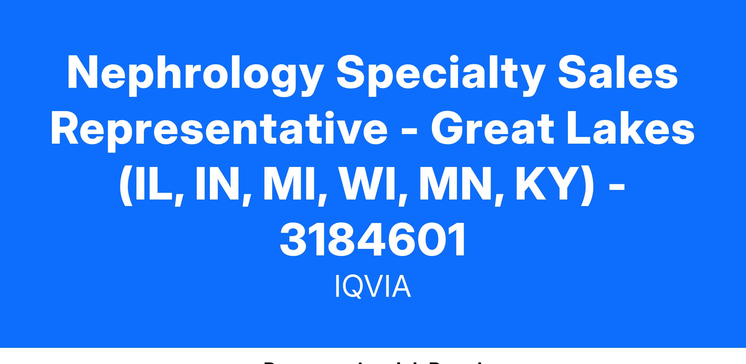 This is an exciting opportunity to join IQVIA as a Nephrology Specialty Sales Representative to drive sales for novel transplant diagnostic tests. The Nephrology Specialty Sales Representative will be assigned a territory as part of a national team to educate and sell in the nephrology/kidney transplant key stakeholder community.