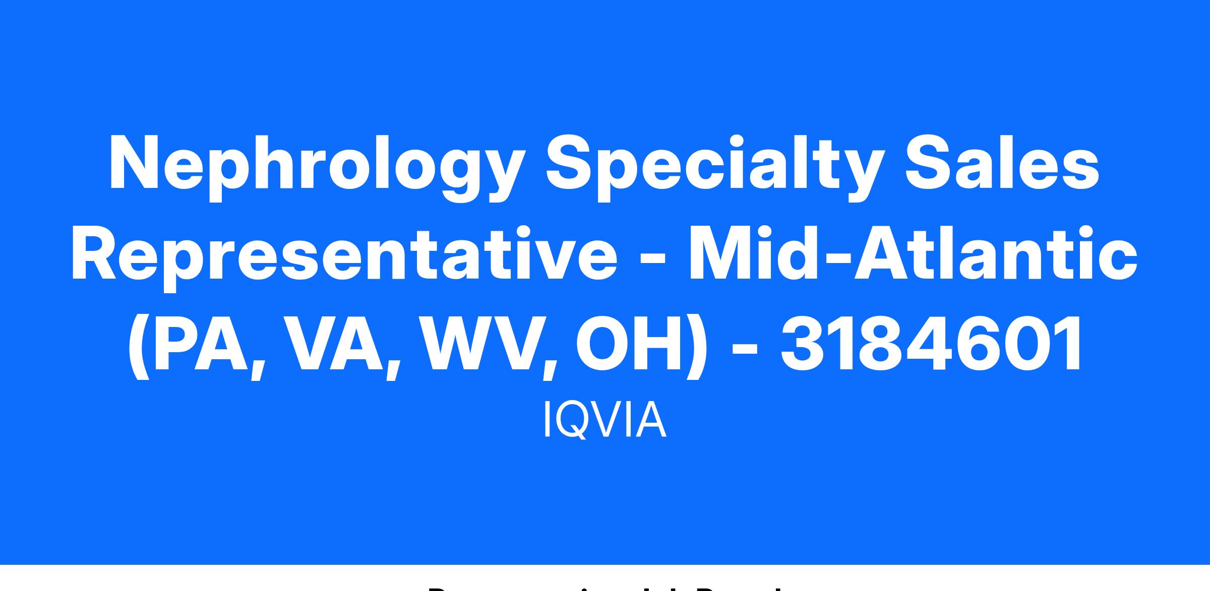 Nephrology Specialty Sales Representative - Mid-Atlantic (PA, VA, WV, OH) - 3184601