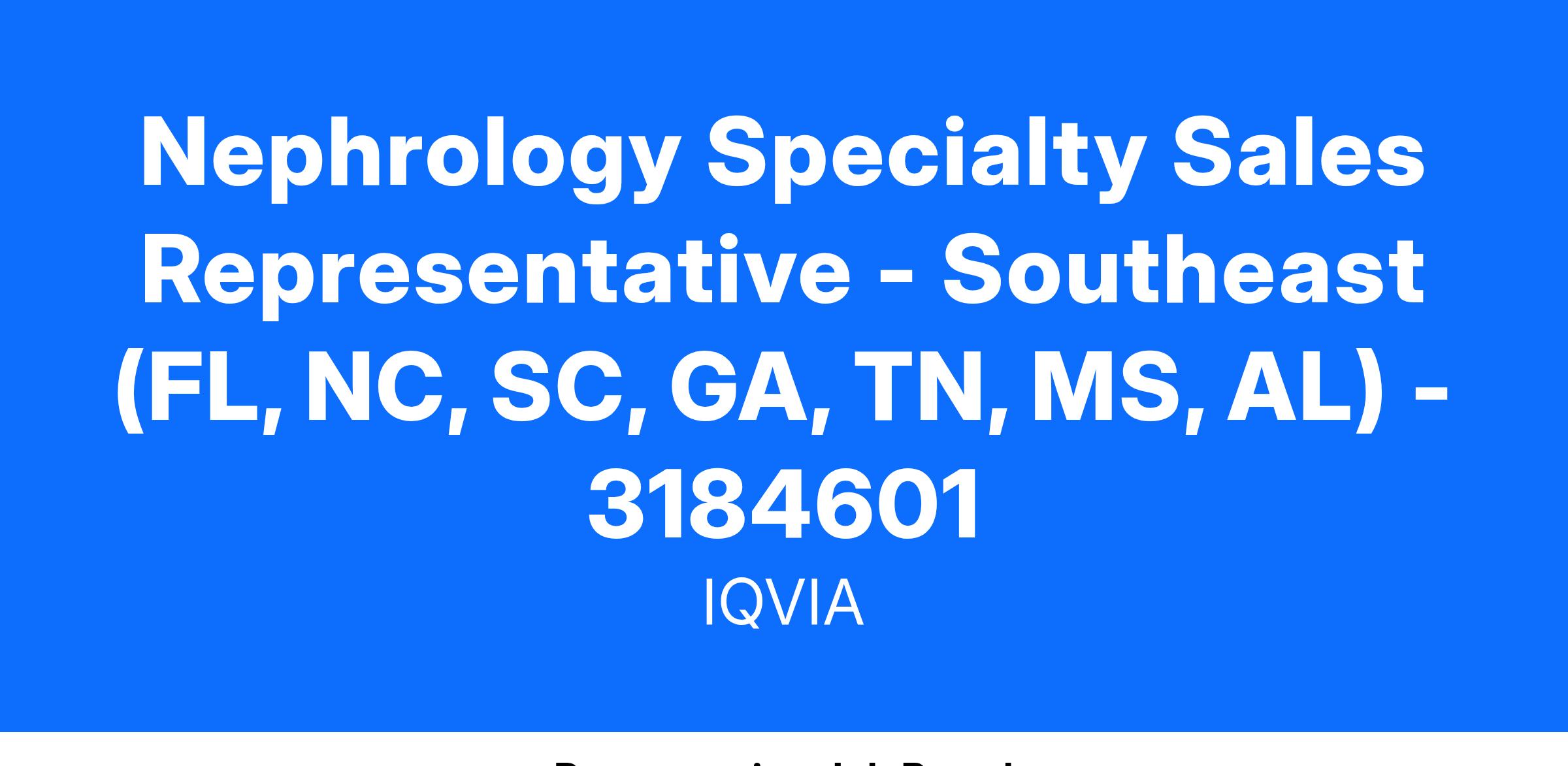 This is an exciting opportunity to join IQVIA as a Nephrology Specialty Sales Representative to drive sales for novel transplant diagnostic tests. The Nephrology Specialty Sales Representative will be assigned a territory as part of a national team to educate and sell in the nephrology/kidney transplant key stakeholder community.