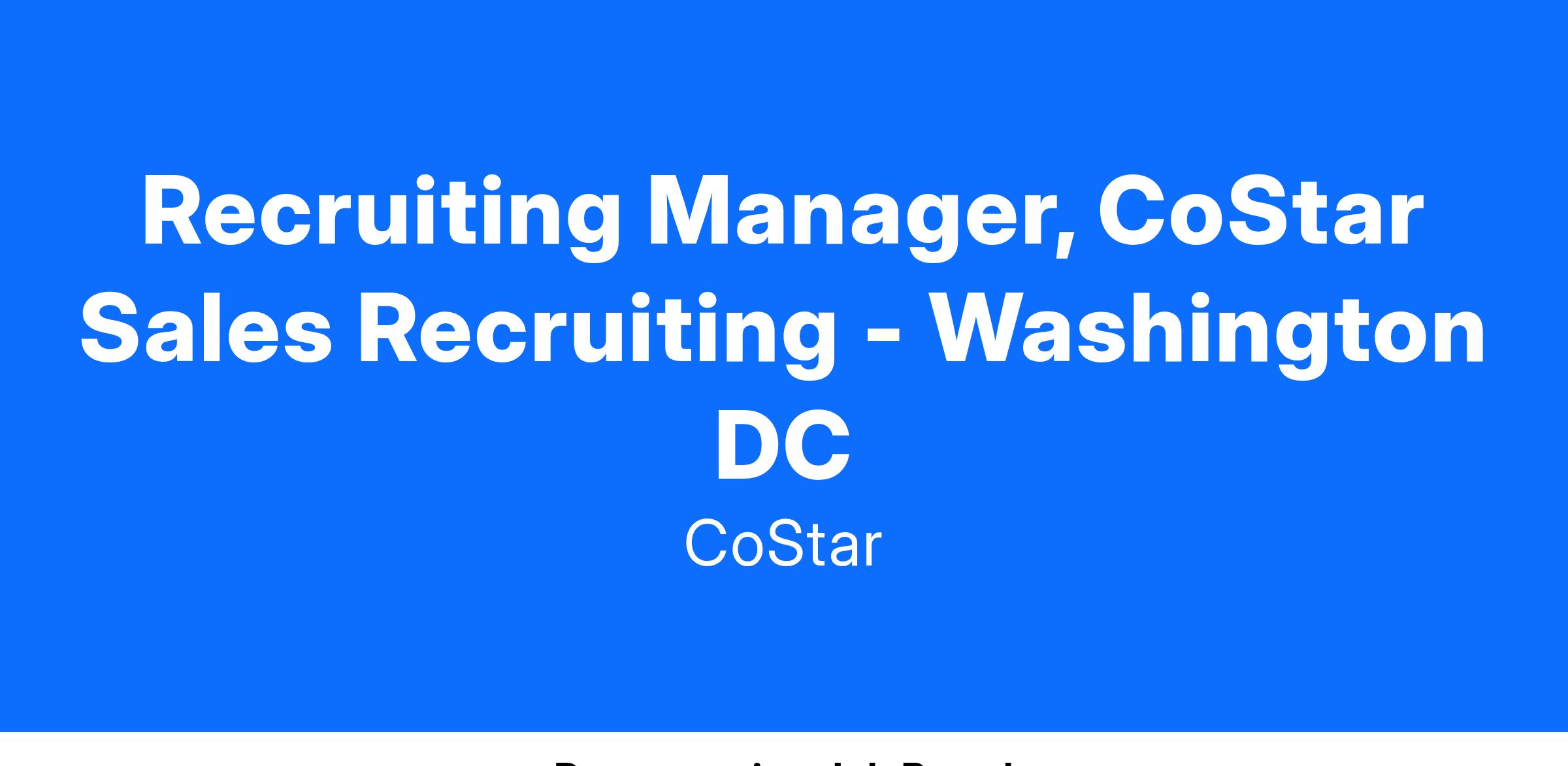 We are looking for a Manager to join the Talent Acquisition team who will oversee a team of Sales recruiters in Washington, DC to support the CoStar sales organization. CoStar is the most comprehensive platform for commercial real estate information, analytics and news with a 35 year + track record of proven success. The manager will lead the talent sourcing, recruitment, and selection process for a growing business with a focus on bringing top sales talent to the team. They will partner with Human Resources Operations, Compensation and Business Partners to ensure a seamless process and partnership. In this role, the Manager will play a critical role in the development of the talent within the team and contribute to broader Talent Acquisition strategy and execution.
