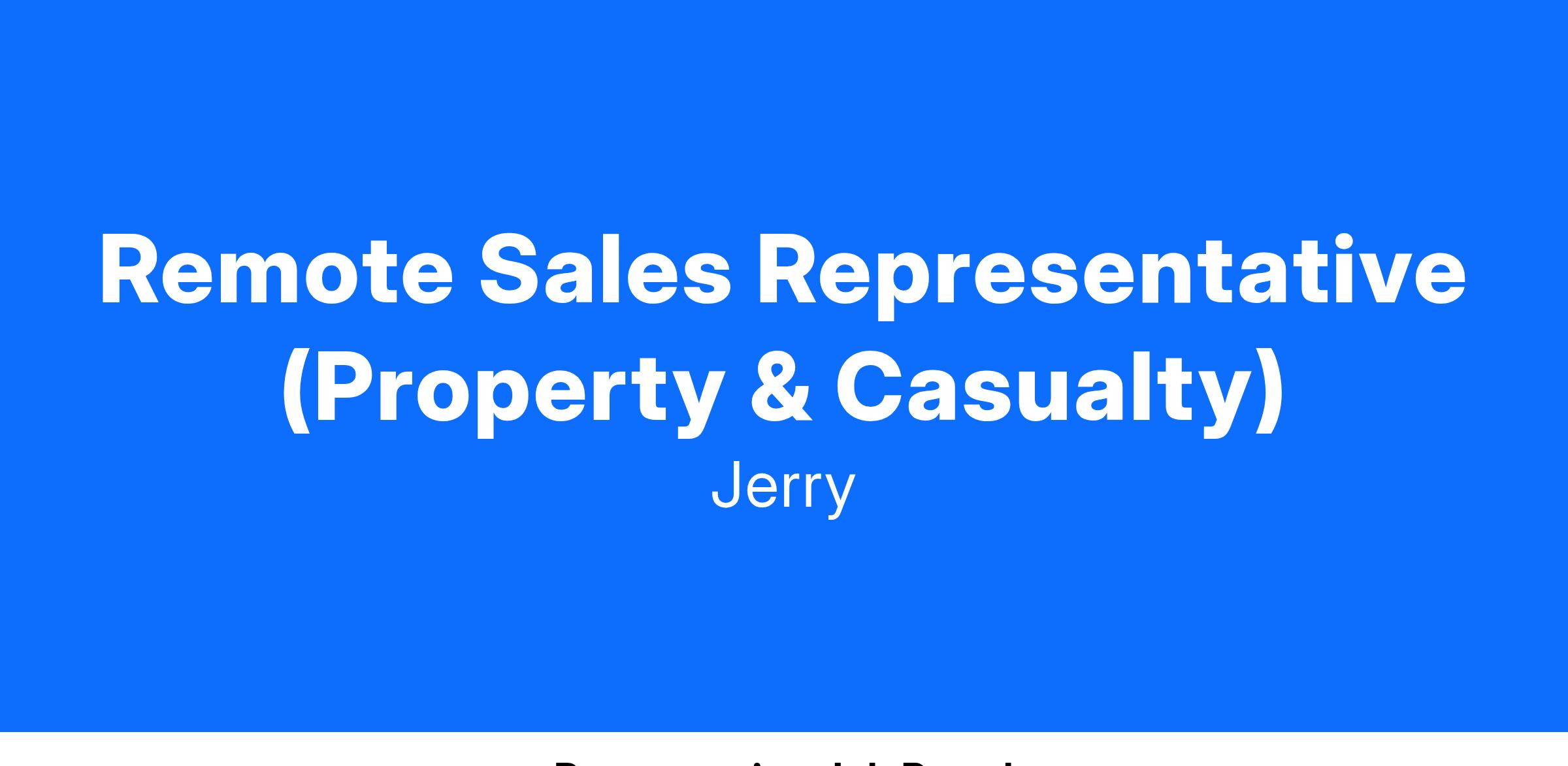 We are looking for a Remote Sales Representative who can work weekends and evenings to join our growing team! This role is 100% remote, we provide all work equipment needed. In this role, you will be responsible for helping prospective customers understand and choose the right insurance policies for them from one of Jerry's 55+ insurance carrier partners. All of our customers come to us directly from our mobile or web app, so no outbound calls needed. If you are looking for an opportunity to make a measurable difference in the lives of millions, we'd love to hear from you!