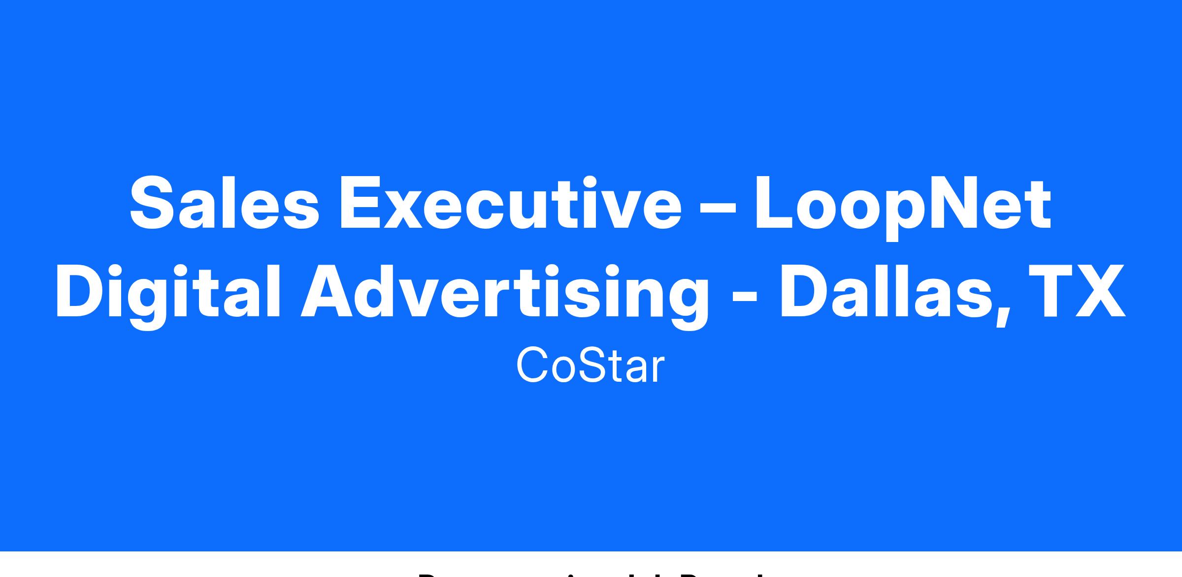 As a Sales Executive with LoopNet you will be part of a growth-oriented, innovative company and represent the industry’s most sophisticated digital advertising and marketing solutions. You will partner with the world’s top owners and brokers to develop a comprehensive digital marketing strategy to showcase and differentiate their portfolio of properties online. Key to your success will be your ability to build long-lasting, service-focused, customer relationships. You will achieve this in part by advising on product frequency, reach and brand efficacy and highlighting return on investment using our proprietary analytic tools and reporting capabilities. Day to day, you will leverage CoStar Group’s deep knowledge and expertise in the Commercial Real Estate industry to build your client portfolio by prospecting, studying industry trends and news, and conducting effective product demonstrations.
