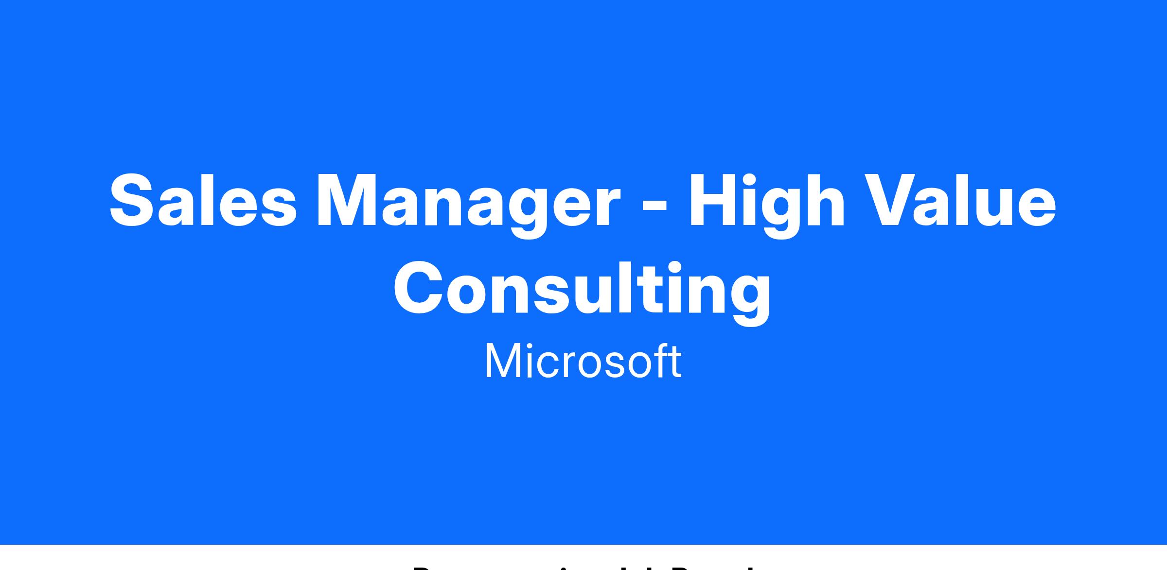 The Sales Manager - High Value Consulting will analyze and build upon sales strategy and execution to drive success within their market based on Microsoft's and customer/partner needs. Drives the business within the segment, creating clarity on strategic direction with managers and teams. Coaches ongoing customer value realization and satisfaction contributing to net-new revenue and business growth. Applies industry and market expertise, proactively leading team(s) towards identifying solutions to drive new opportunities and strategies in alignment with customers needs. Leads the development and implementation of go-to-market for maximizing revenue, consumption, and growth across solution areas. Understands drivers of Digital & Artificial Intelligence transformation relevant to their customers and partners across business units and advises customers to optimally leverage transformation solutions across solution areas.