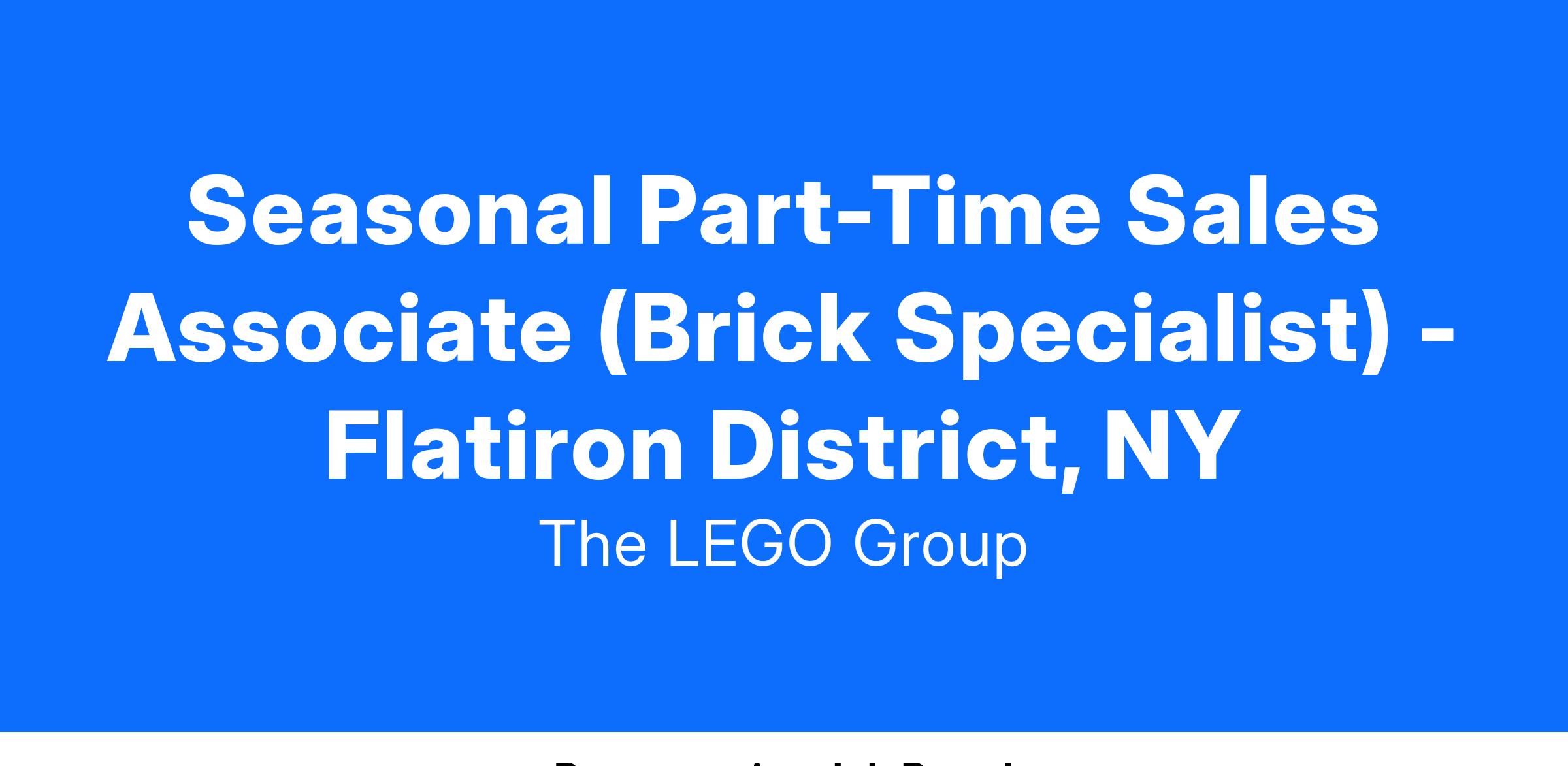 Join the LEGO® Brand Retail team as a Seasonal “Brick Specialist” and provide inspirational guest experiences in an interactive and vibrant store environment. We are looking for energetic, enthusiastic individuals to join us on a seasonal, part-time basis.