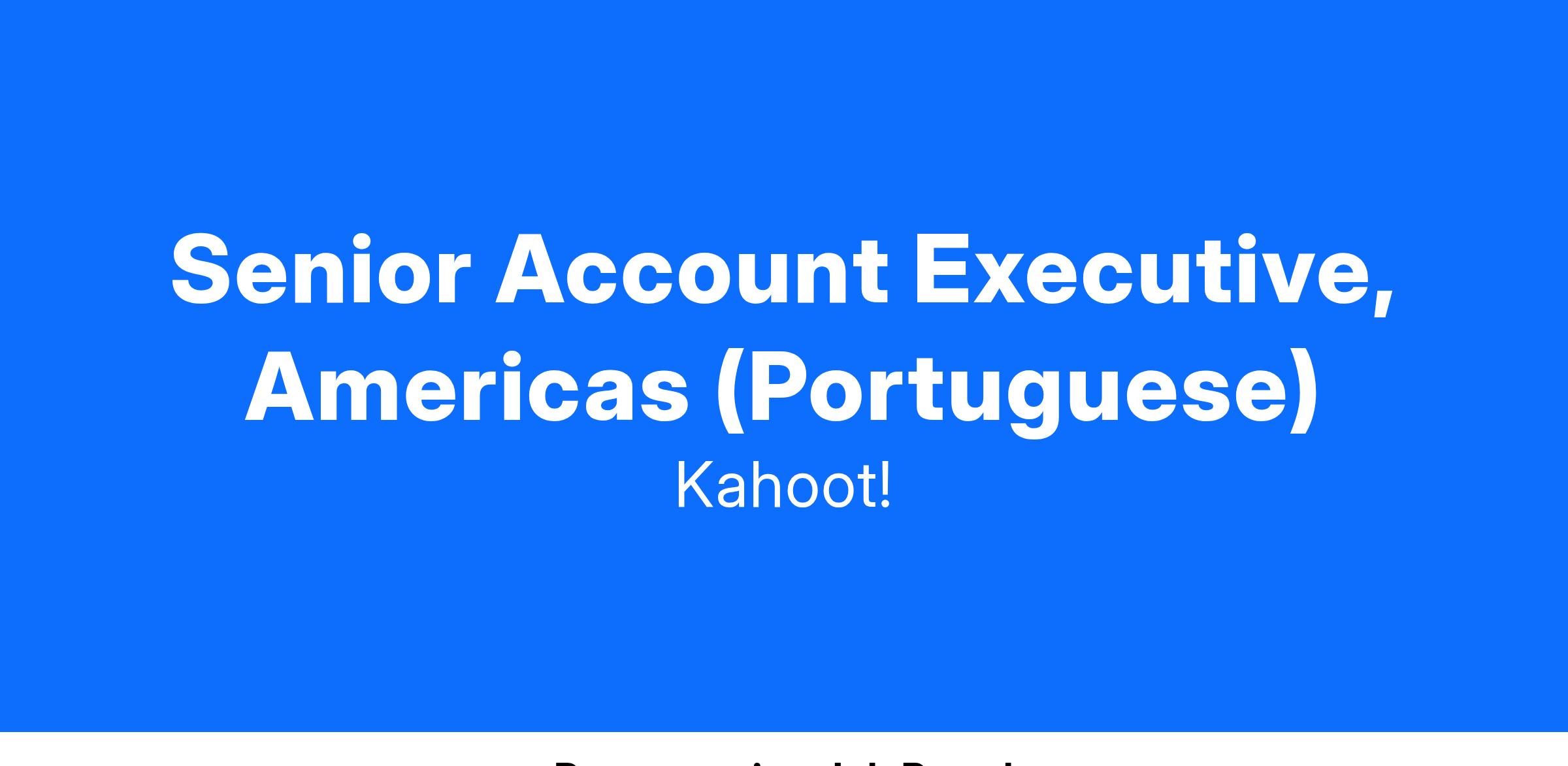 We are looking for a Senior Account Executive, with Portuguese fluency, to join our dynamic US sales team. The Senior Account Executive will take charge of the entire sales journey, develop and nurture a dynamic pipeline, and lead exciting sales initiatives for Kahoot! At Work, working with a variety of global accounts.