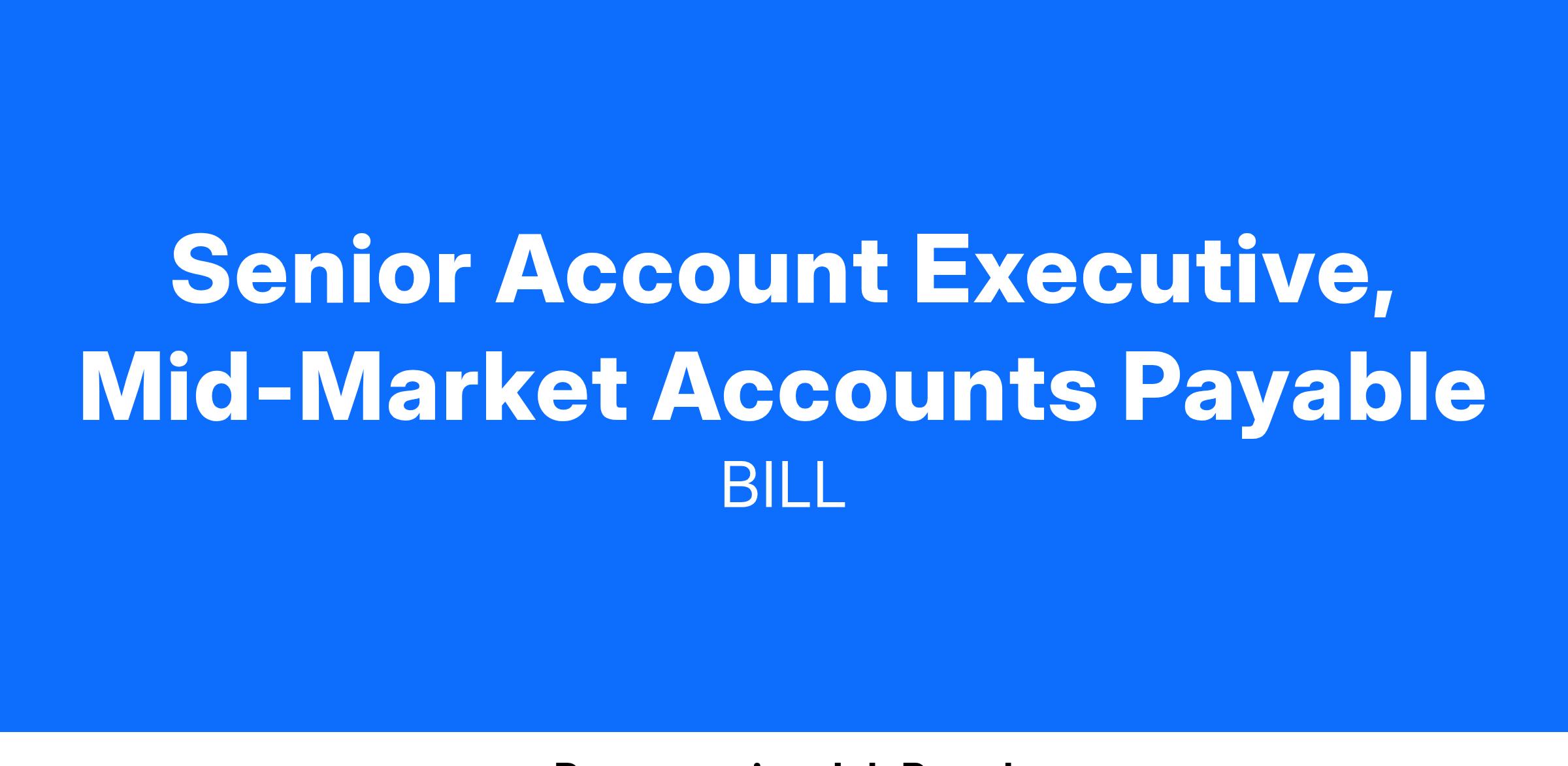 The Mid-Market Account Executive role at BILL provides an extremely unique opportunity -- we’re looking for talented and ambitious individuals who can both manage a high velocity sales cycle while also navigating a very strategic sales process with C-Level executives. You will be a member of the team responsible for 100% of your pipeline through a full sales cycle, including prospecting, disco, demo, contract signing. This critical role builds excellent relationships with our mid-market cross functional teams, such as Marketing, Operations, Enablement, and many more. You will provide prospects with secure, faster, simpler, and safer digital payment solutions for their A/P, A/R, Spend & Expense, and other cash-flow needs.It is an outstanding time to join the industry leader in a huge market opportunity.