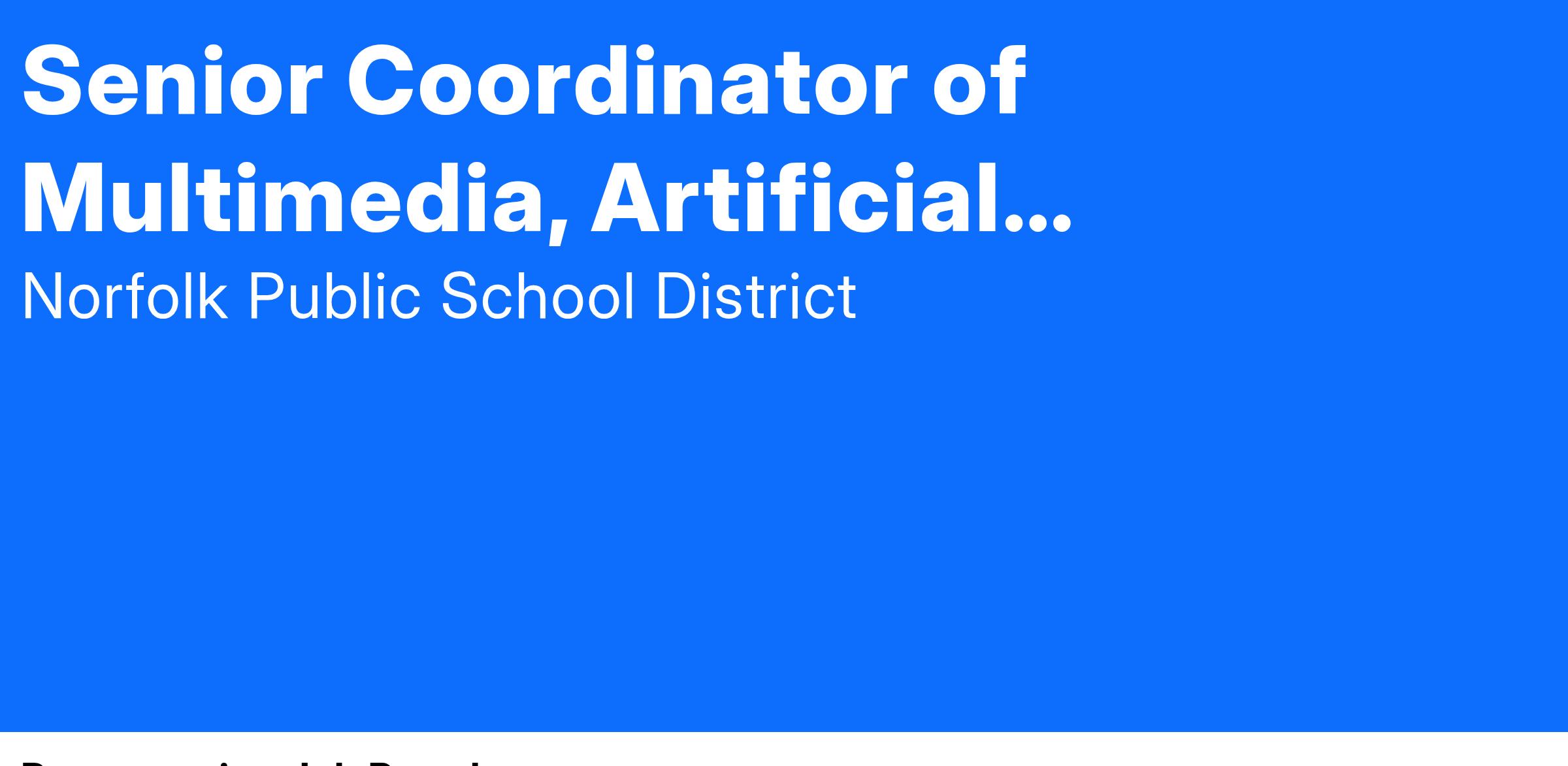 The Senior Coordinator of Multimedia, Artificial Intelligence, and Digital Innovation is responsible for advancing strategies, policies, and procedures in support of Norfolk Public Schools’ operational, training, and public relations objectives through the use of artificial intelligence (AI) and emerging digital technology. This role is responsible for the management and maintenance of web-based content (such as the division website and intranet) and leveraging AI-powered tools and techniques to enhance efficiency and effectiveness throughout the Office of Communications and Community Engagement. The Senior Coordinator serves as a subject matter expert in matters pertaining to AI implementation, and digital infrastructure, collaborating with stakeholders, managing resources, and providing multimedia and digital support to organizational initiatives.