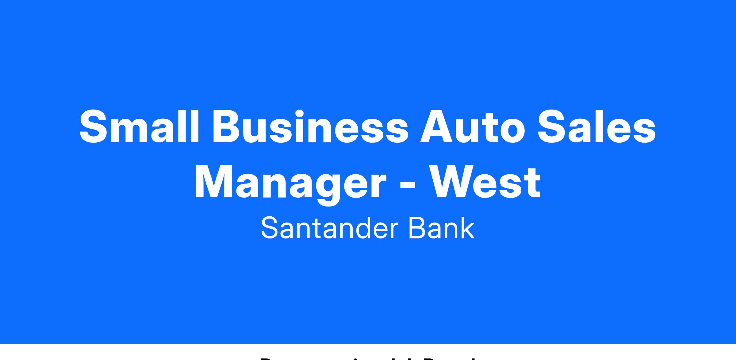 The Small Business Auto Sales Manager (Sr. Specialist, Dealer Sales Annual - IC6) will work with the Santander Sales team and their dealers to grow Small Business originations with the West region of the country.