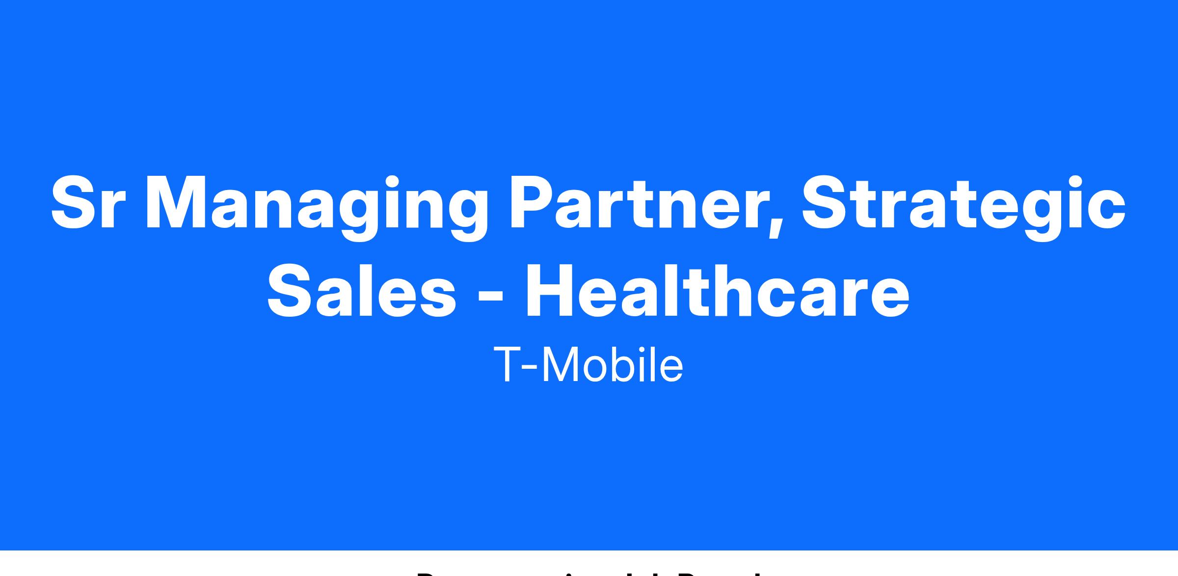 The Sr Managing Partner, Strategic Sales reports to the Director of Strategic Accounts and will lead all sales motions for a team of strategic sales professionals. The Sr Managing Partner is focused on a select number of strategic accounts, accountable for developing a strategy to drive growth in revenue and number of sales across these accounts (reviewing & revising on a quarterly basis). This strategy should include planning for each available product solution T-Mobile offers, with a focus on driving voice, data, UCC and IoT solutions using the T-Mobile network to achieve sales goals, subscriber and revenue targets, and customer retention objectives. The Sr Managing Partner tasked with ensuring T-Mobile is connected across the management layers of each of the accounts in the team's focus.