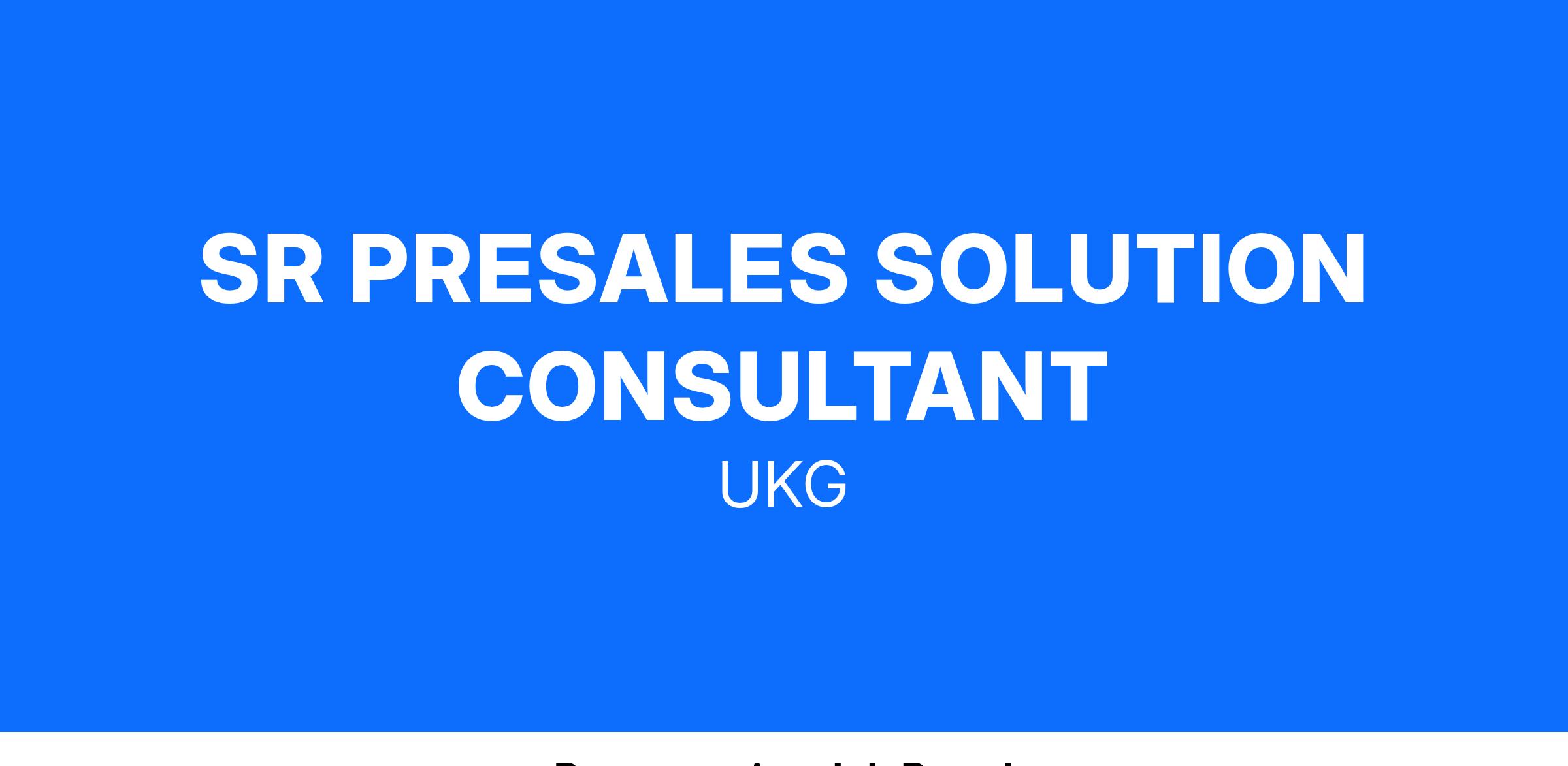 UKG is looking for a Senior Presales Solution Consultant to join our family. If you are talented, energetic, and committed to delivering quality demonstrations of our UKG HCM and WFM solutions, this is the perfect place to work and grow professionally.