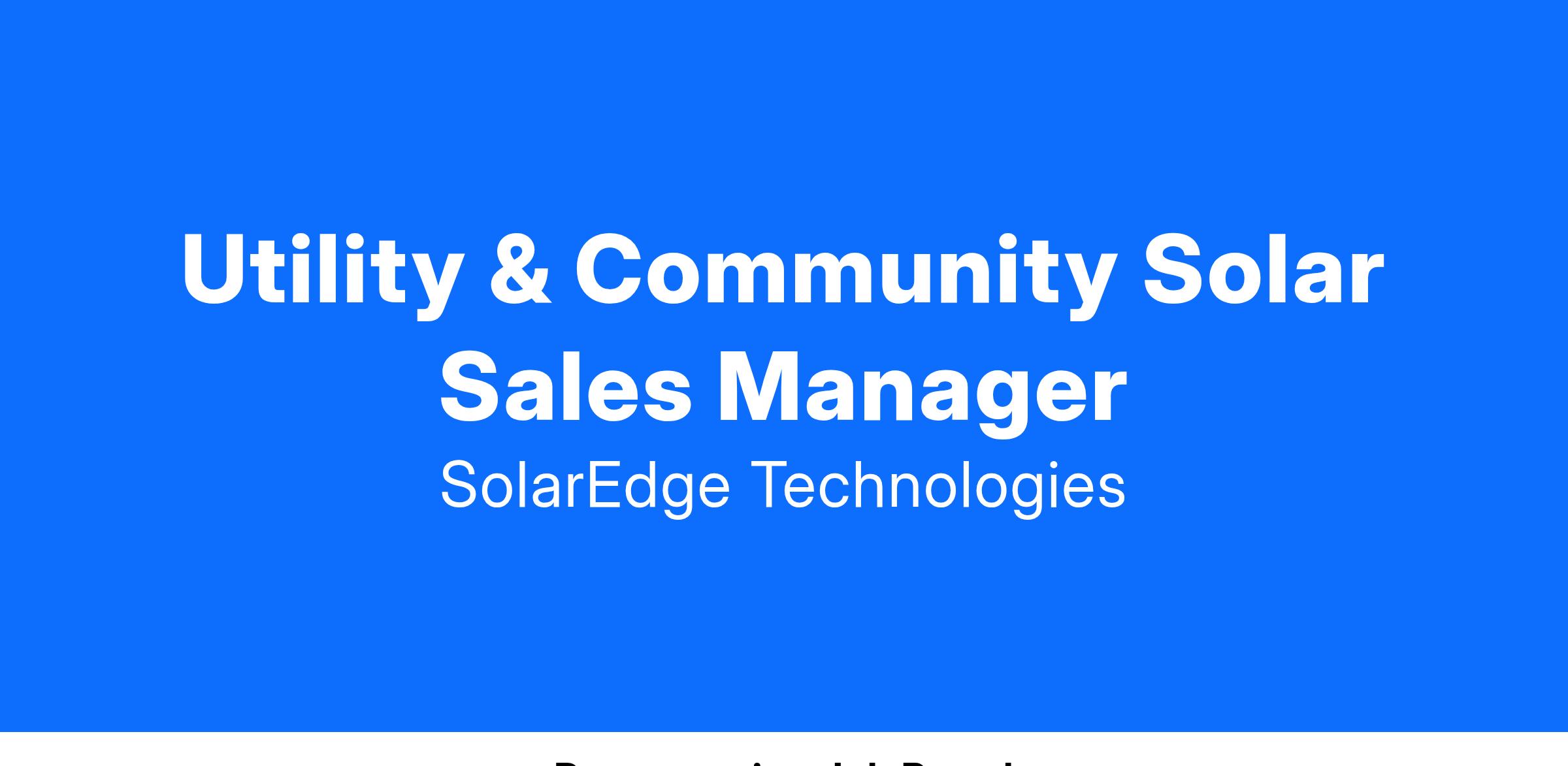 SolarEdge (NASDAQ: SEDG), is a global leader in high-performance smart energy technology, with over 5000 employees, offices in 34 countries, and millions of products installed in over 133 countries. Our diverse product offering comprises intelligent solar inverters, battery storage, backup systems, EV charging, and complete home energy management ecosystems. By leveraging world-class engineering capabilities and with a relentless focus on innovation, we strive to create a world where clean, green energy from the sun is the primary source of power for our homes, businesses, and just about everywhere we thrive. This position provides the successful candidate with the opportunity to join SolarEdge’s North American Sales Team and have a major part in leading the company’s sales efforts in the Utility scale and Community Solar segment of the solar industry.
