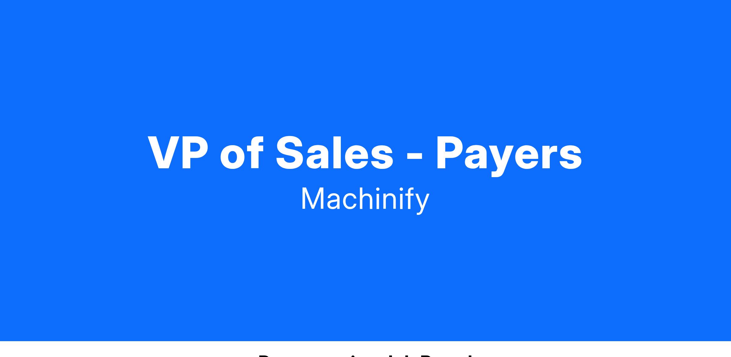Machinify is seeking a VP of Sales - Healthcare Payer Partnerships to identify, qualify and close new partnership opportunities with health insurance payers, helping us execute on our vision of transforming health care.